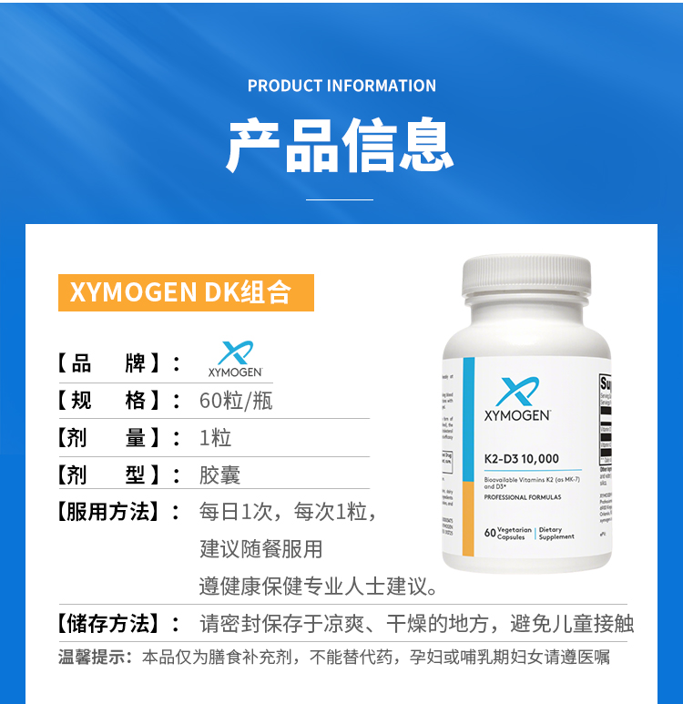 【效期至27年7月】DK组合胶囊 XYMOGEN K2-D3 10,000IU 60粒/瓶