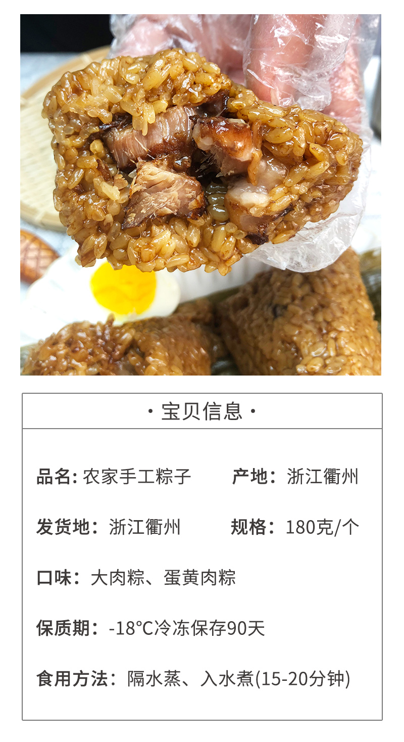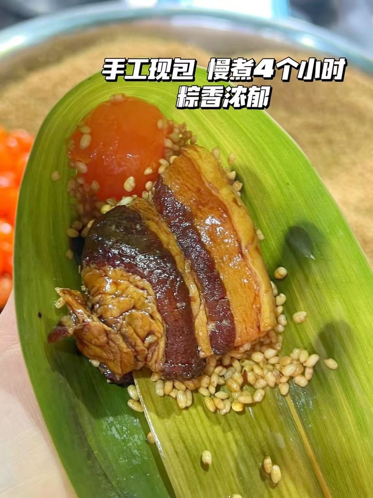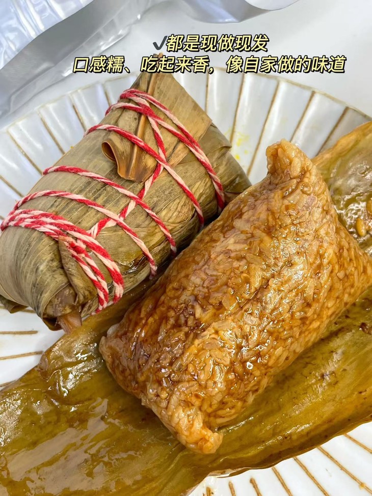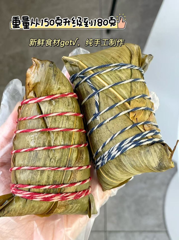 纯手工包粽,还原传统老味道。糯米颗粒感十足,越嚼越香,肉鲜嫩不柴。