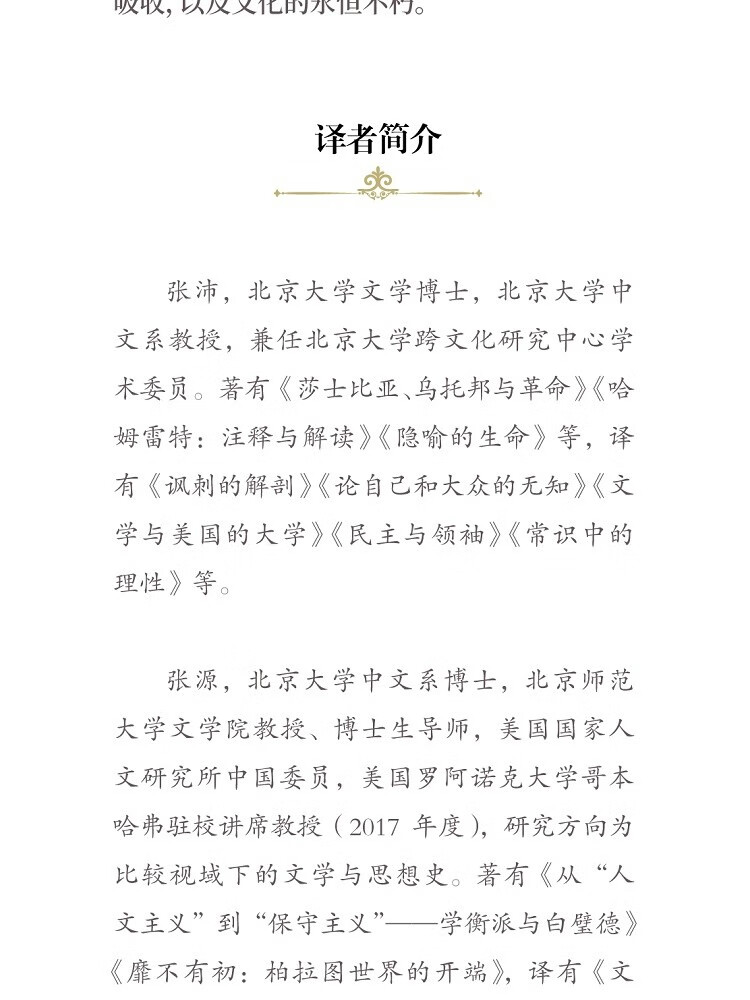 张沛,北京大学文学博士,北京大学中文系教授,兼任北京大学跨文化研究中心学术委员。著有《莎士比亚、乌托邦与革命》《哈姆雷特:注释与解读》《隐喻的生命》等,译有《讽刺的解剖》《论自己和大众的无知》《文学与美国的大学》《民主与领袖》《常识中的理性》等。