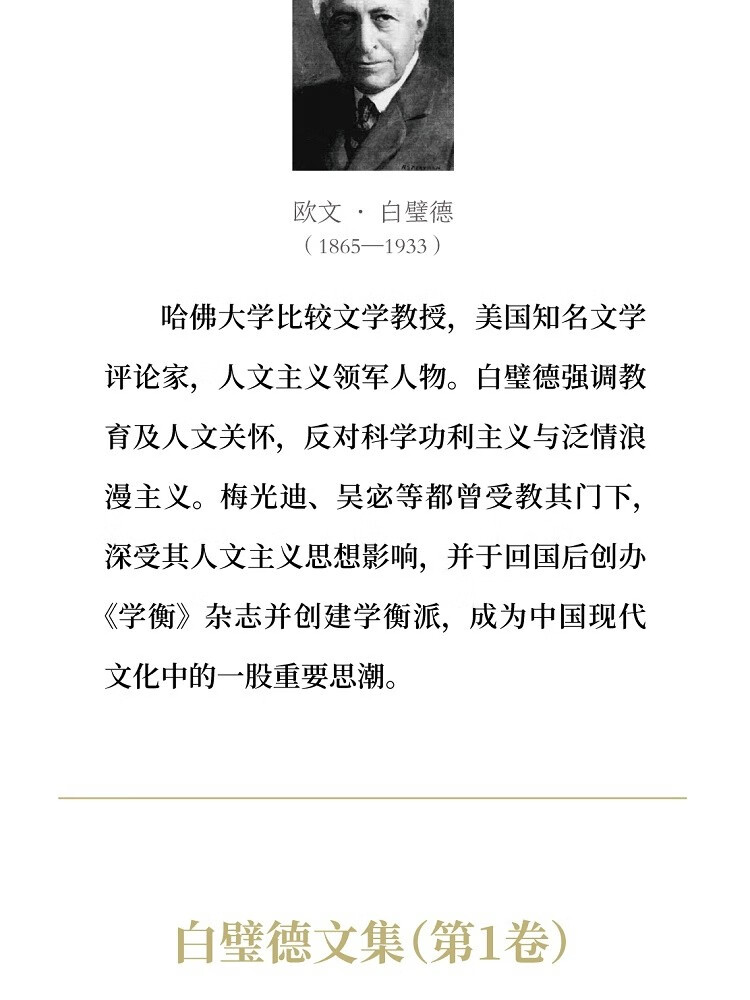 欧文•白璧德,哈佛大学比较文学教授,美国知名文学评论家,人文主义领军人物。白璧德强调教育及人文关怀,反对科学功利主义与泛情浪漫主义。梅光迪、吴宓等都曾受教其门下,深受其人文主义思想影响,而于回国后创办《学衡》杂志并创建学衡派,成为中国现代文化中的一股重要思潮。