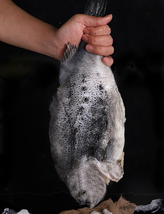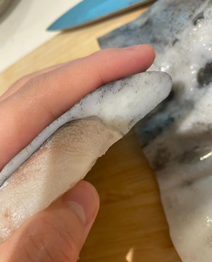. 将海参斑放入冷水中浸泡5-7分钟⏰,将鱼身表面的冰衣融掉,但鱼身保持较硬的状态.