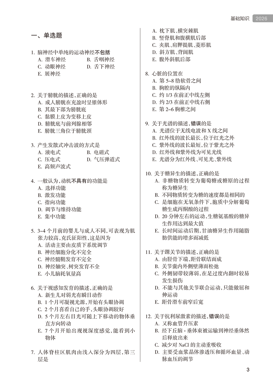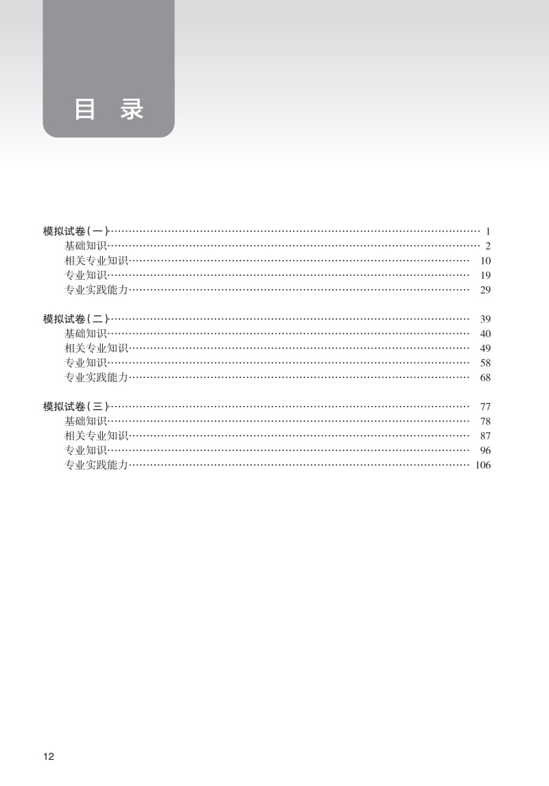“全国卫生专业技术资格考试习题集丛书”以新考试大纲和全国卫生专业技术资格考试用书编写专家委员会编写的考试指导为依据,编写工作遵循科学、严谨、客观、规范的原则,严格按照实际考试的科目划分和题型分布进行编写,切实考查考生对知识点的掌握程度和专业水平。本系列丛书包括《同步习题与全真模拟》《同步习题集》《模拟试卷》等,能够有效帮助考生考前复习、自测和反馈学习成果。《模拟试卷》全面模拟考试真题,针对考生临考备战进行综合性巩固。题目难度和题型分布参考实际考试情况设定。除附参考答案外,部分重点、难点问题附有解析。每套试卷根据试题不同的难易度设置了不同的建议完成时间,仿真度高,是考前冲刺的重要用书。