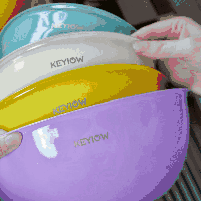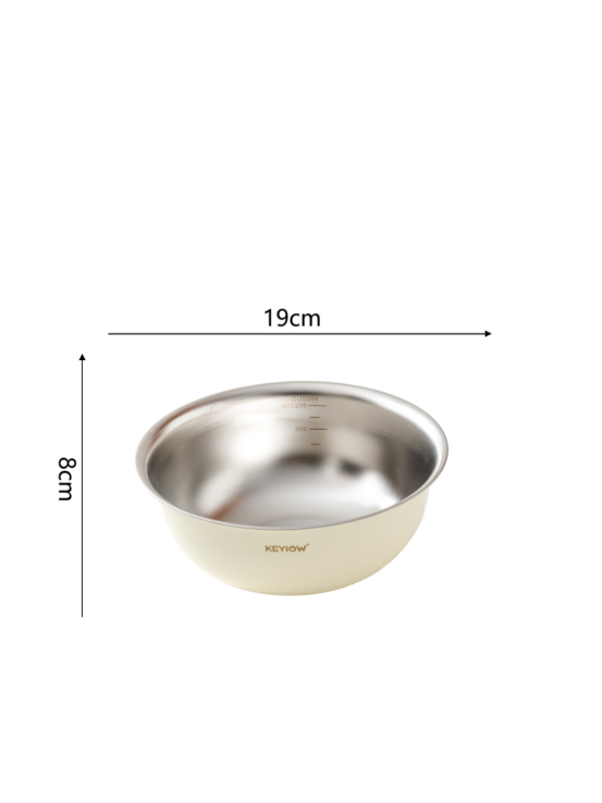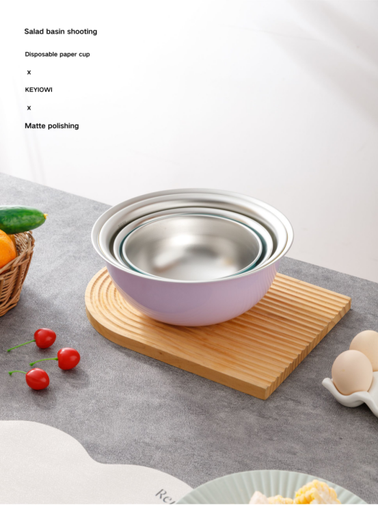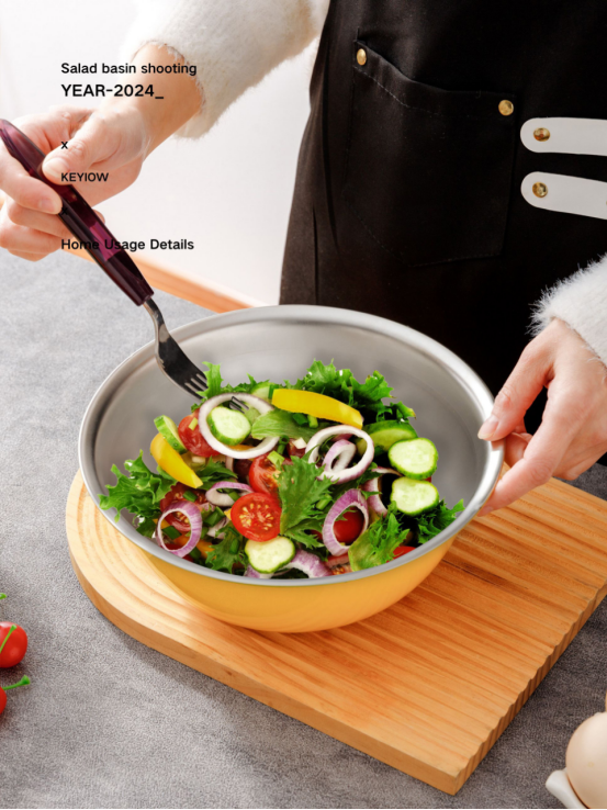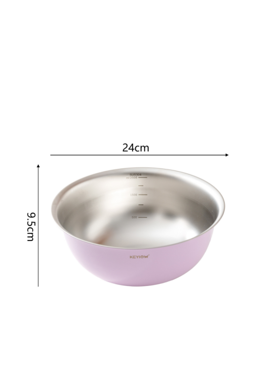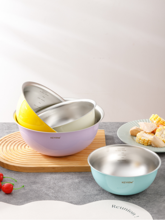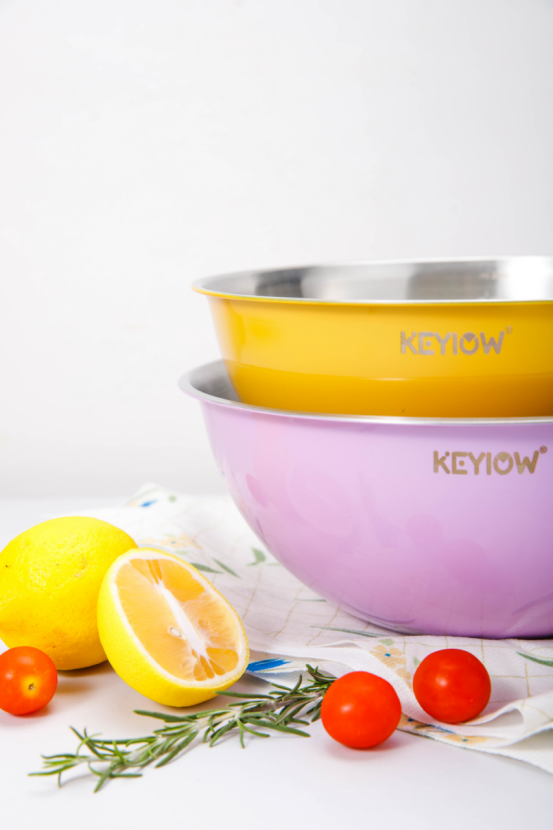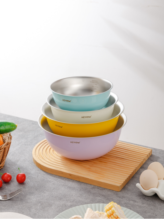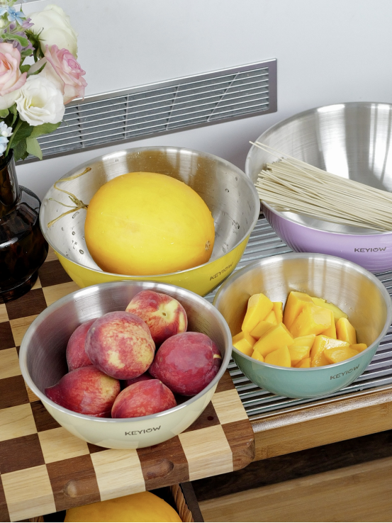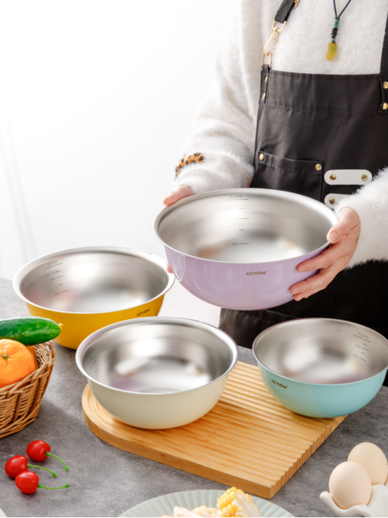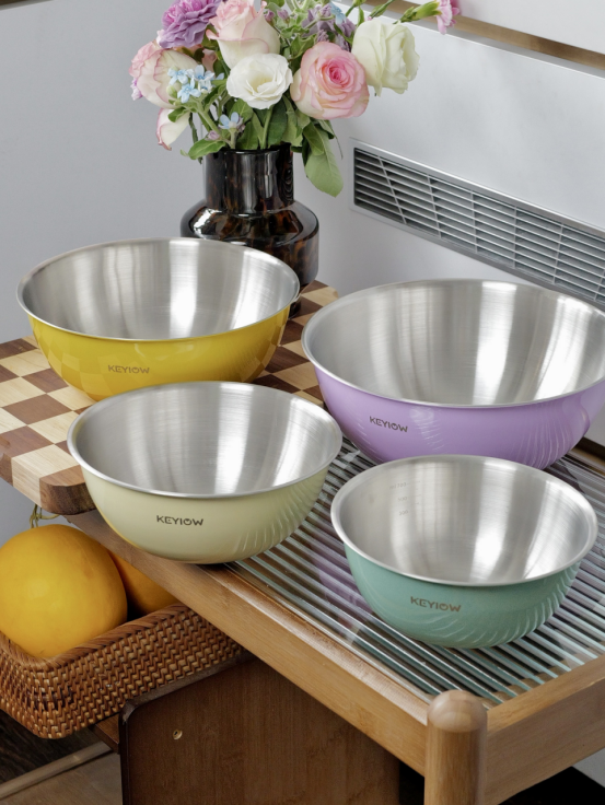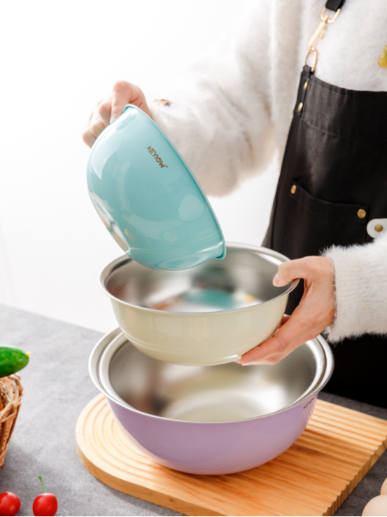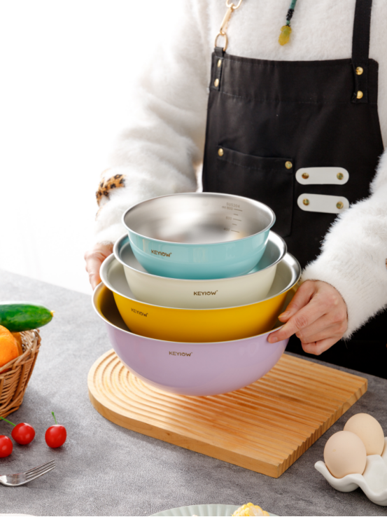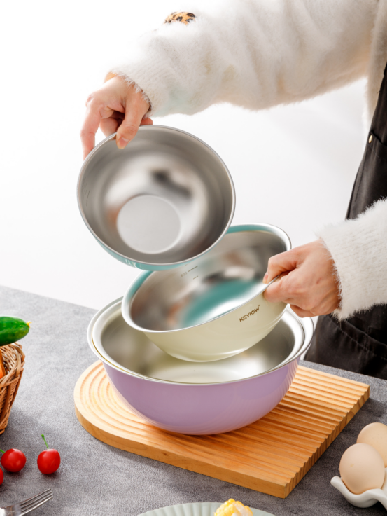 KEYIOW 304不锈钢亮面沙拉盆3件套/4件套--亚马逊在售折合人民币388,咱们39.9/49.9带回家 *钢琴烤漆外表,不言而来的高级感,不易刮花,防粘防油,其成本也非常高 *不易产生划痕,盆壁加高防飞溅*带刻度线,方便度量 ,一目 了然,宽厚边角,手感舒适 。 甜甜的亮面糖果色系,北欧的简约风范,用美治愈你做美食的四季。。。 不锈钢盆的颜值天花板‼解决厨房烹饪和日常各种需求! 不仅可以收纳蔬菜、水果,还可以打鸡蛋🥚烘焙🥯平时用来洗洗水果蔬菜都是享受。 厨房收纳方便整洁都非常方便!
