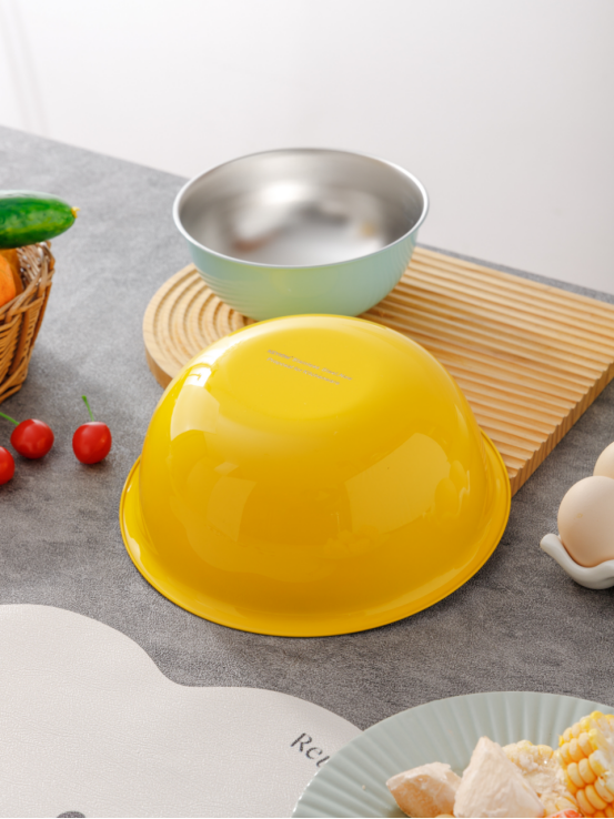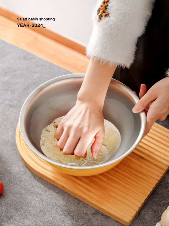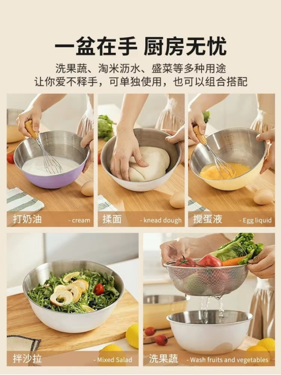 最大号:薰衣草紫,大号:柠檬黄,中号:奶油黄,小号:薄荷绿 日常做盆或当碗使用, 洗果蔬、打蛋、拌奶油、 做沙拉、发酵面粉等都可以,用处多多! 大容量,拌起来更容易, 闪闪发亮的不锈钢沙拉盆🥗 质感厚实,亮面烤漆多了份高级感 , 连带着厨房也亮堂起来~ 也能用来作为汤盆 还能用来拌沙拉 清洗方便,
