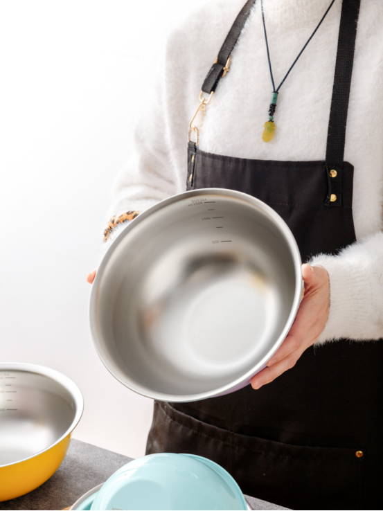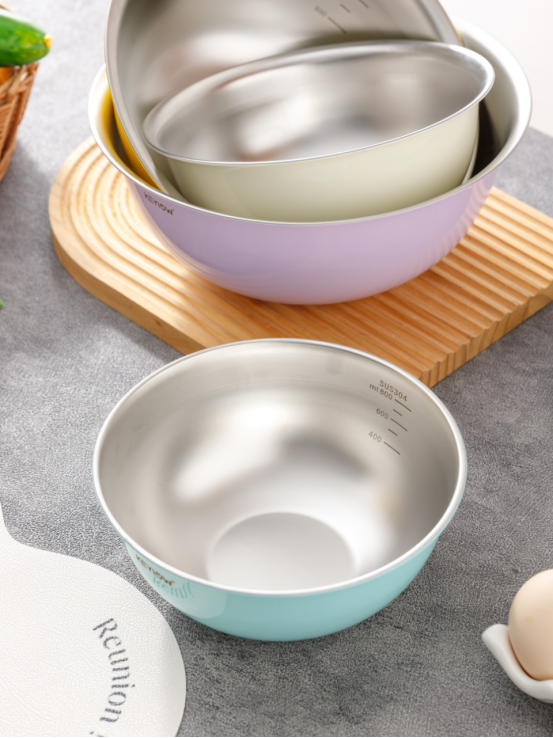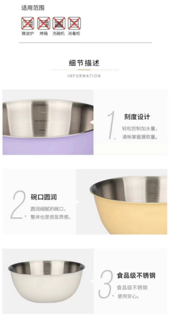 可叠放不占厨房空间 家用足够了,适用大中小全套,都是常规尺寸。 一组三件/四件颜值高,收纳堆叠省心不占地 加厚不锈钢一体成型,内壁带刻度。