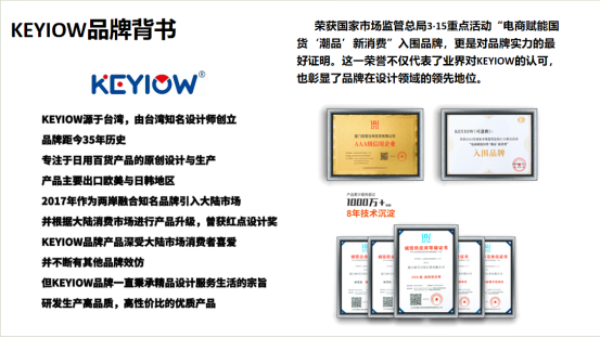 KEYIOW品牌故事 KEYIOW,一个源自宝岛台湾的品牌,自诞生之初就承载着台湾设计师的匠心与情怀。 这个拥有35年历史的品牌,不仅见证了台湾设计的成长与变迁,更在全球市场上展现了其独特的魅力。 凭借卓越的品质和独特的设计,KEYIOW在大陆市场上屡获殊荣。 荣获国家市场监管总局3·15重点活动“电商赋能国货‘潮品’新消费”入围品牌,更是对品牌实力的最好证明。这一荣誉不仅代表了业界对KEYIOW的认 可,也彰显了品牌在设计领域的领先地位。 KEYIOW的创始人,是台湾一位享有盛誉的设计师,他深信设计能够改变生活,让每一件日用品都充满温度与情感。 因此,KEYIOW始终专注于日用百货产品的原创设计与生产,追求每一个细节都完美无瑕。 凭借独特的设计理念精湛的工艺技术,KEYIOW的产品在欧美与日韩地区广受欢迎。 KEYIOW逐渐在国际市场上树立了良好的口碑和品牌形象。