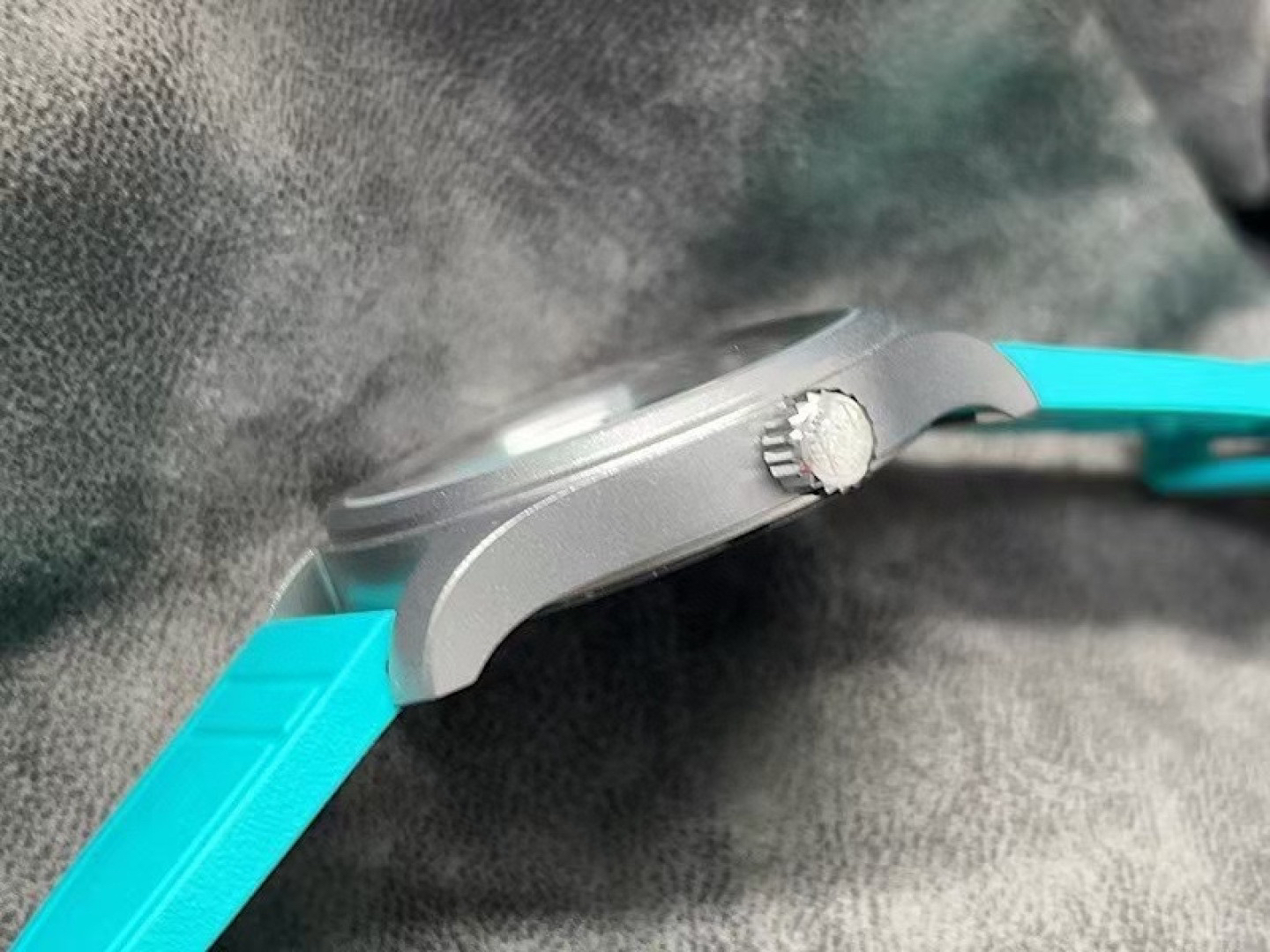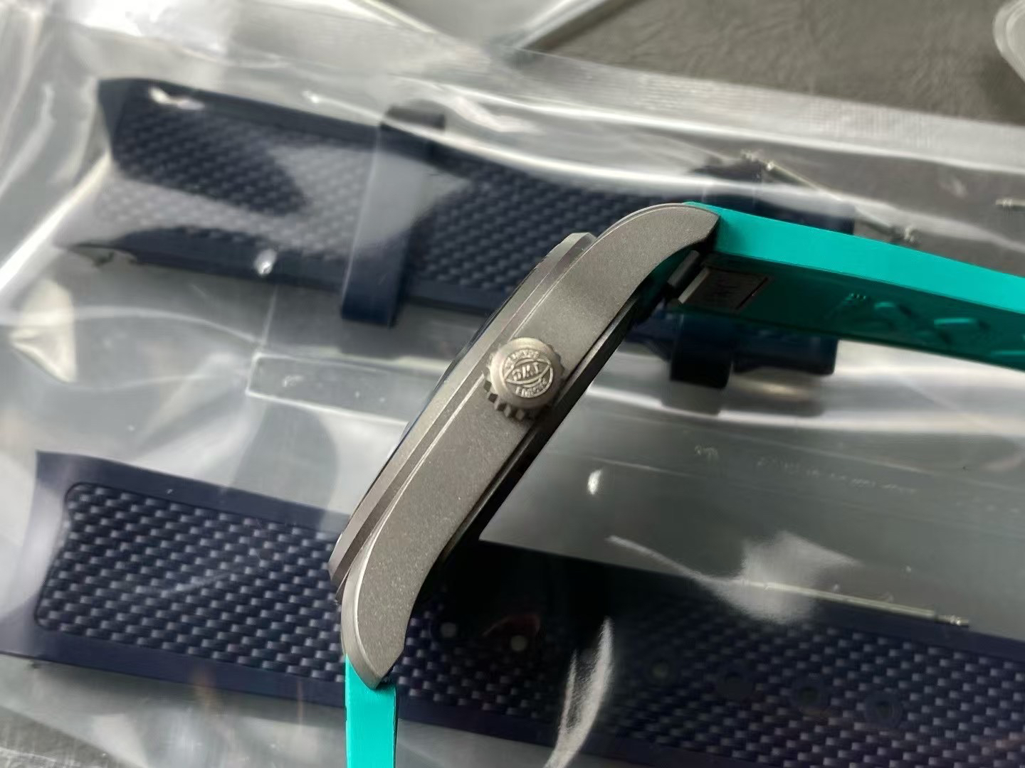 ③加工完成后的五级钛表壳及底盖进行喷覆钻石砂处理;为了达到原版100%相同;反复用不同粗细的钻石砂进行实验;直至和原版比较己完全一致颜色和一致壳身颗粒感后才批量喷覆.