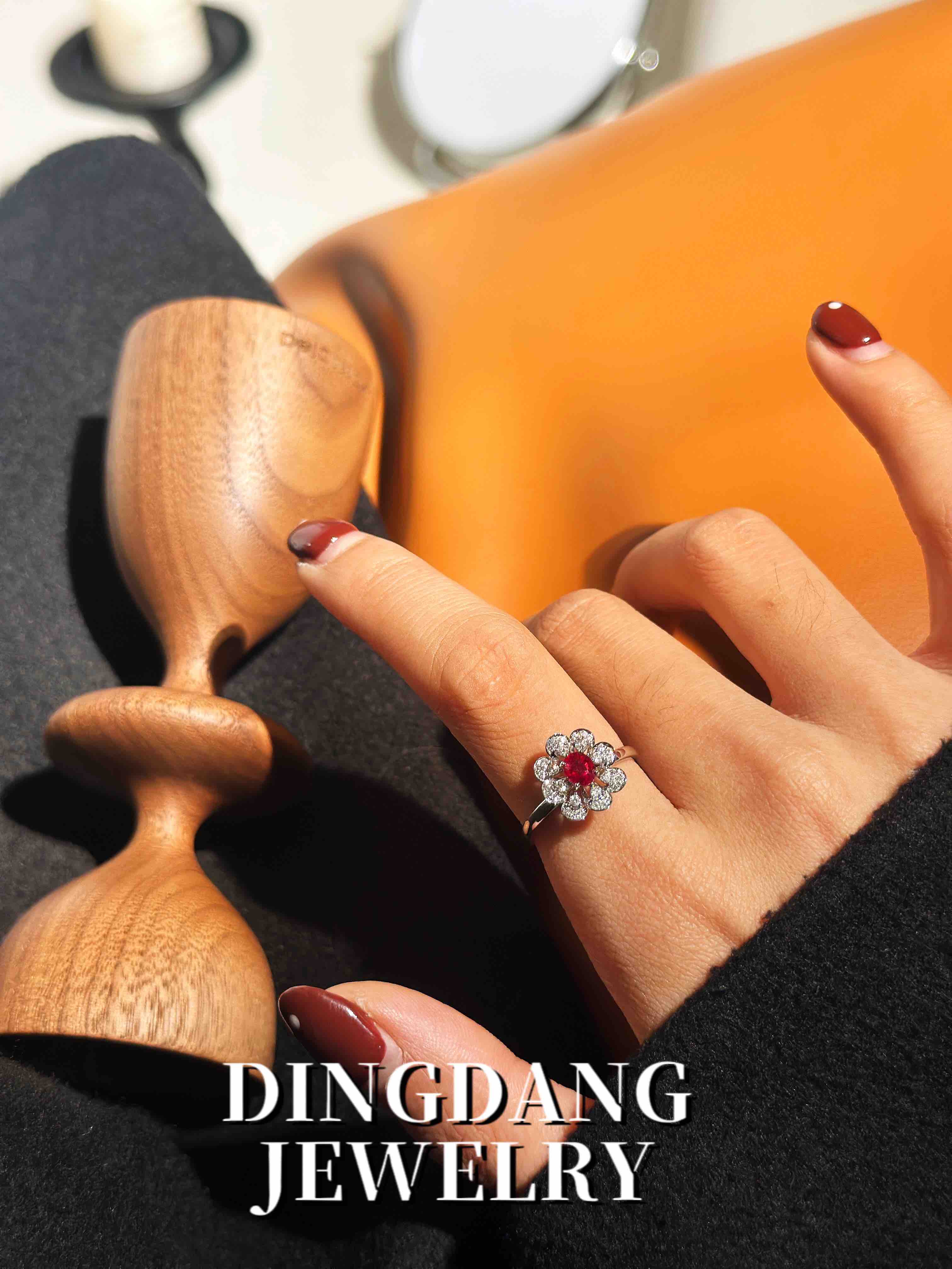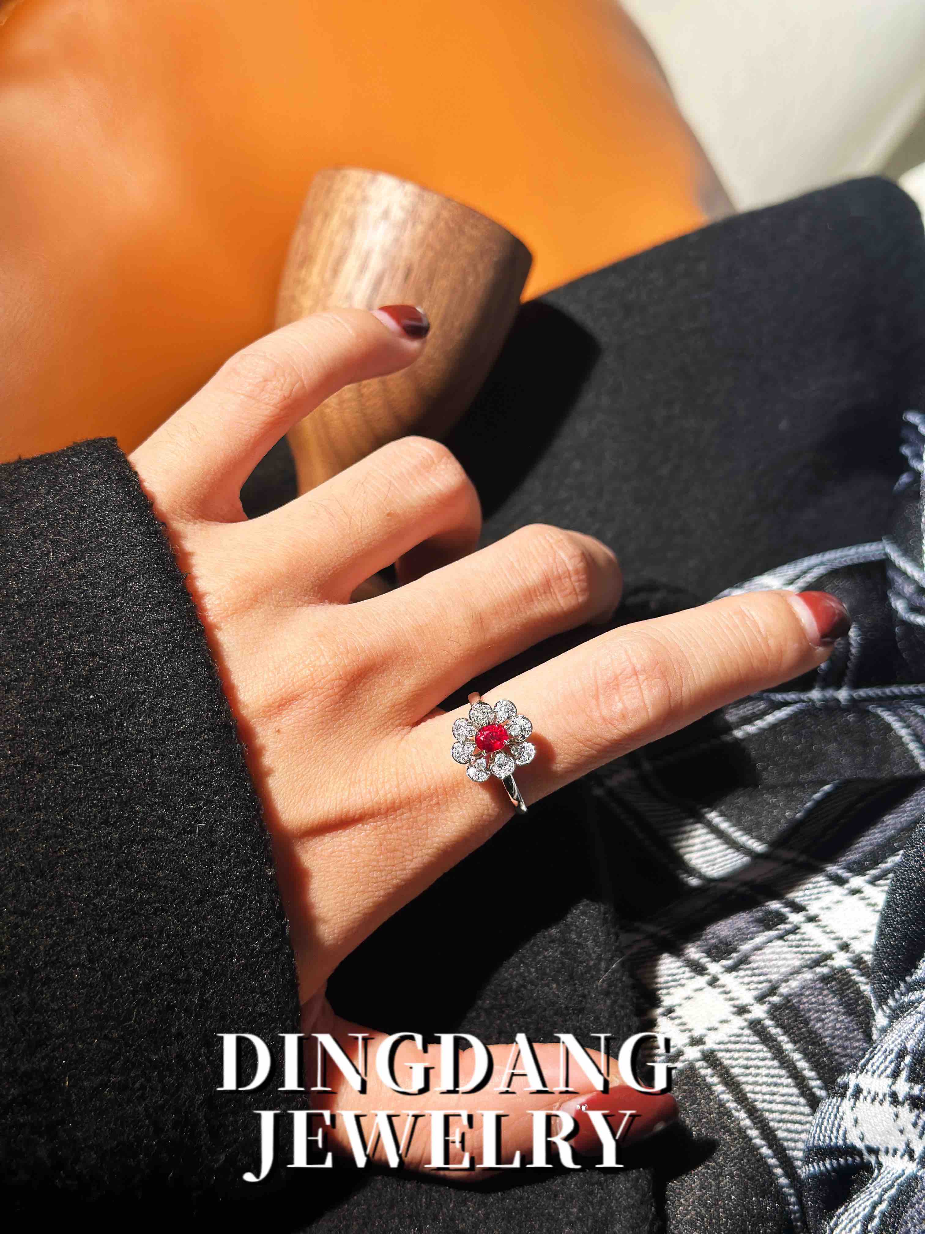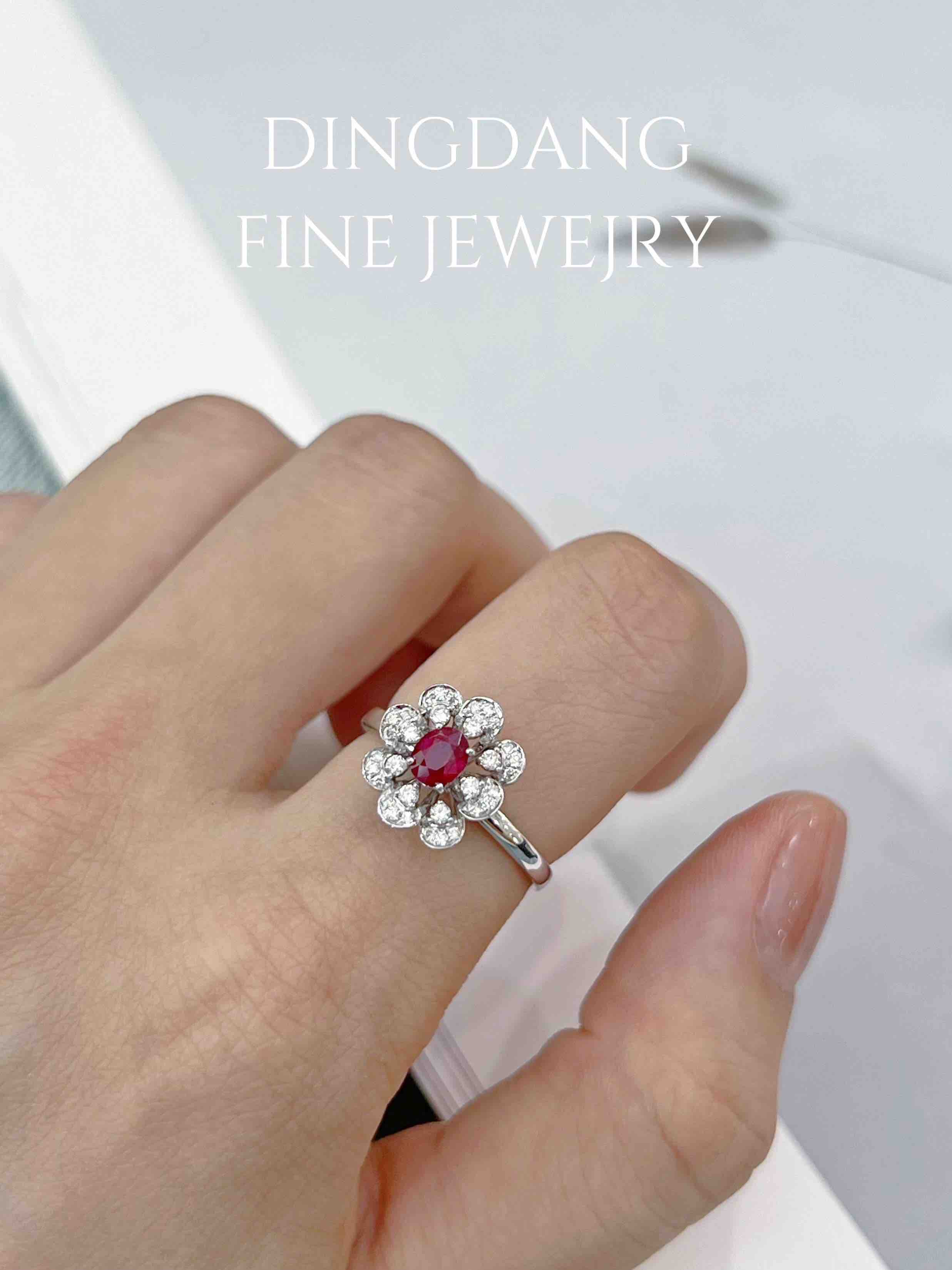 主石为0.385克拉的红宝石,色泽浓郁通透,周边配以8颗色白闪耀的钻石镶嵌成美丽花朵,