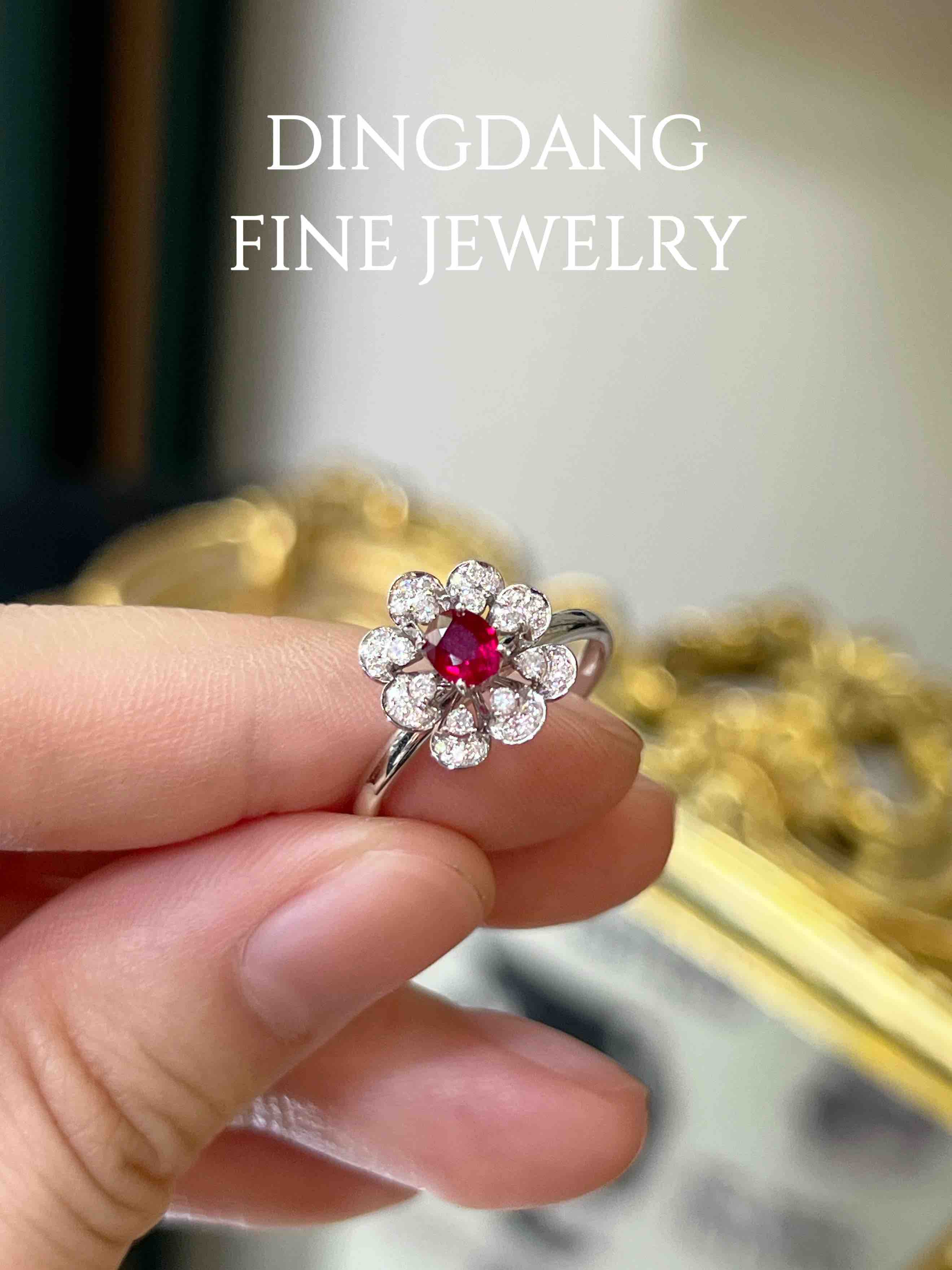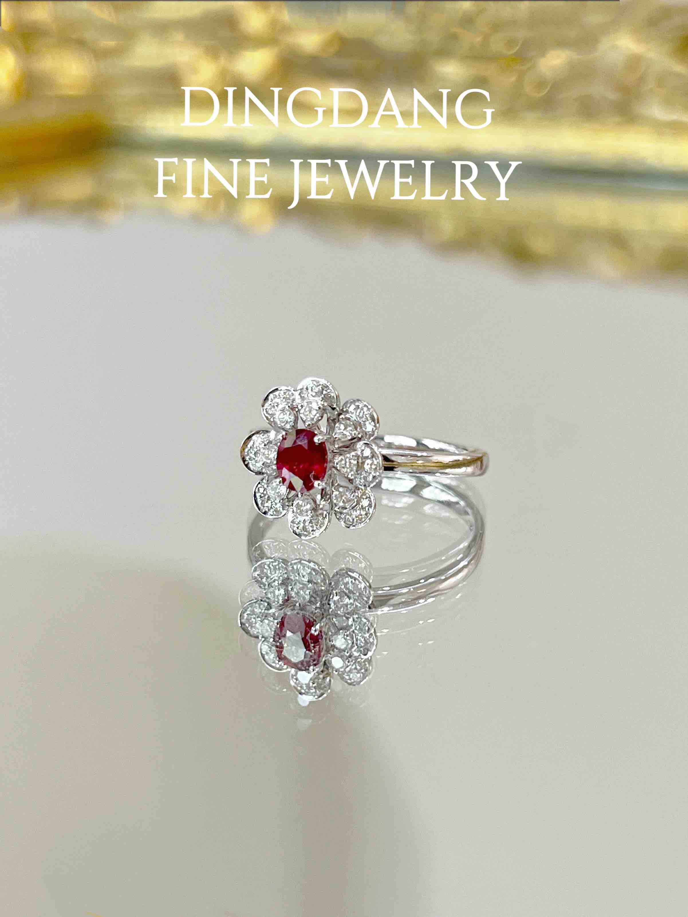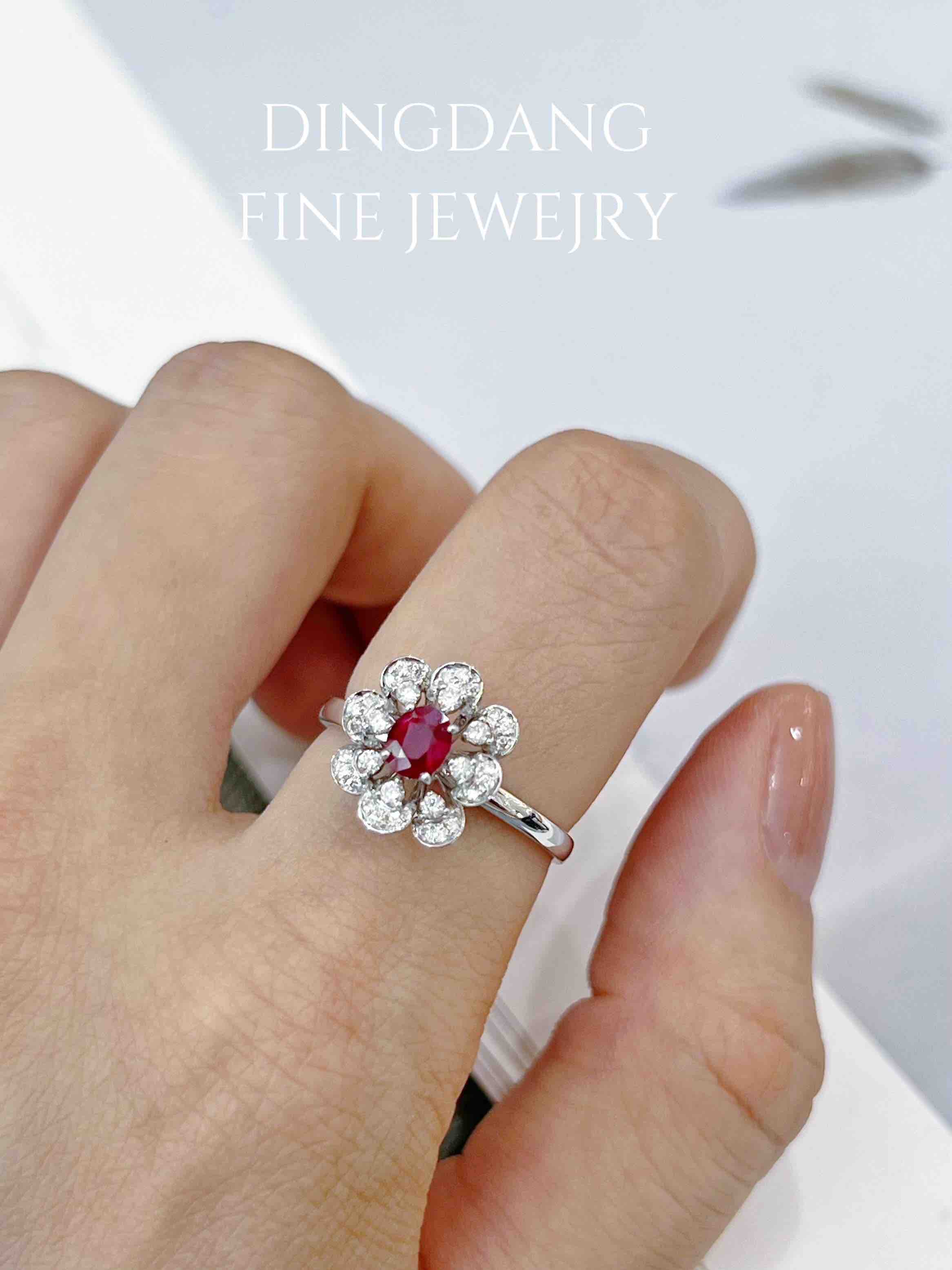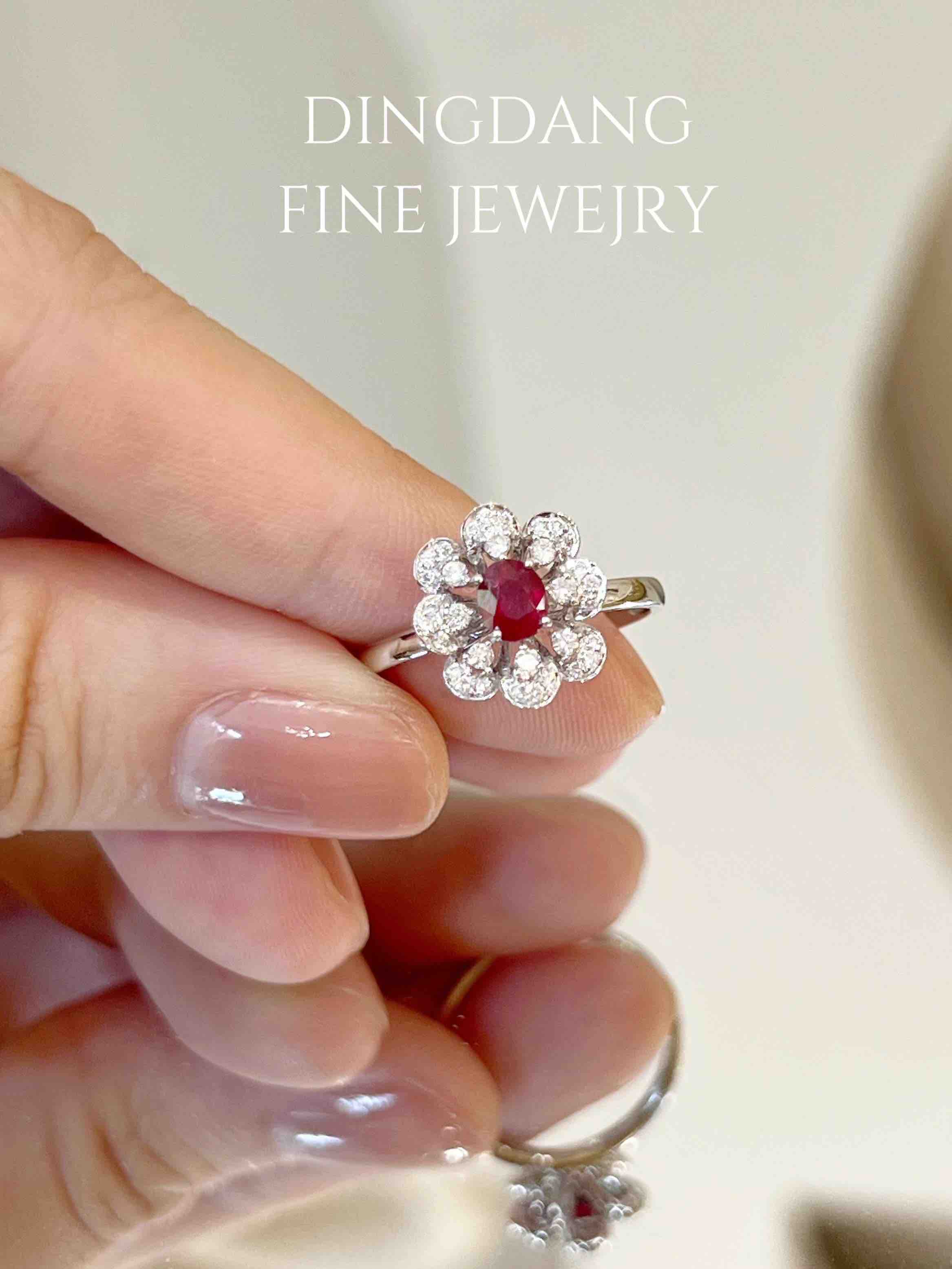主石为0.385克拉的红宝石,色泽浓郁通透,周边配以8颗色白闪耀的钻石镶嵌成美丽花朵,