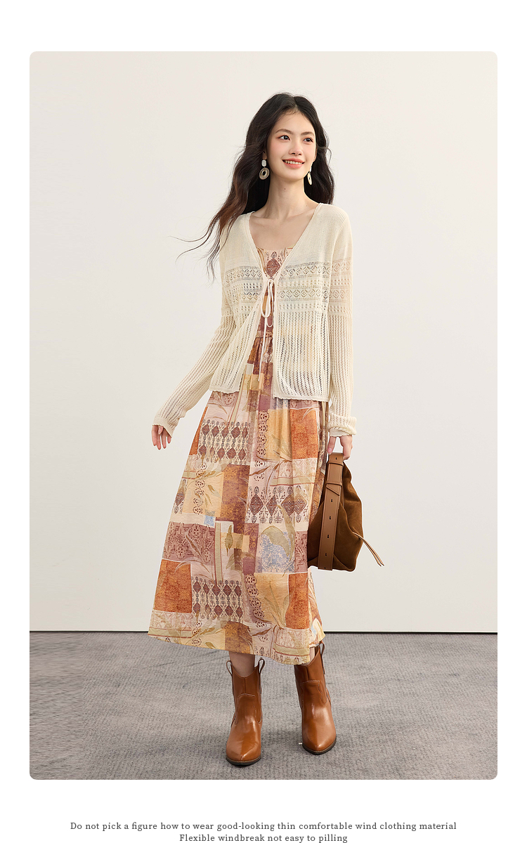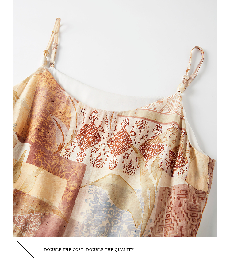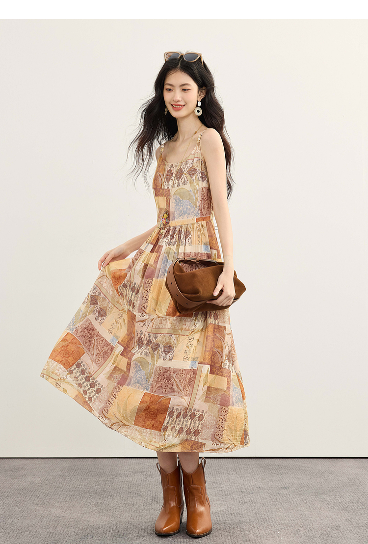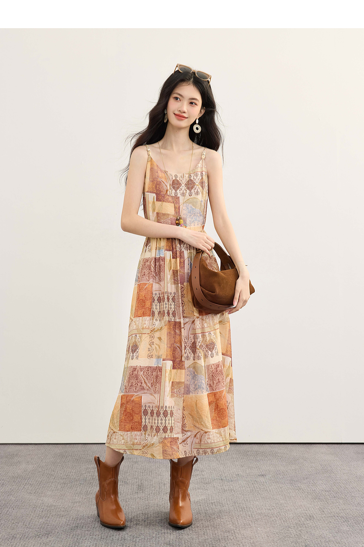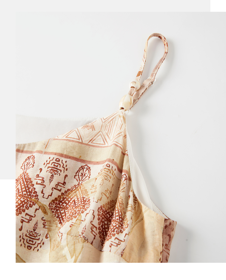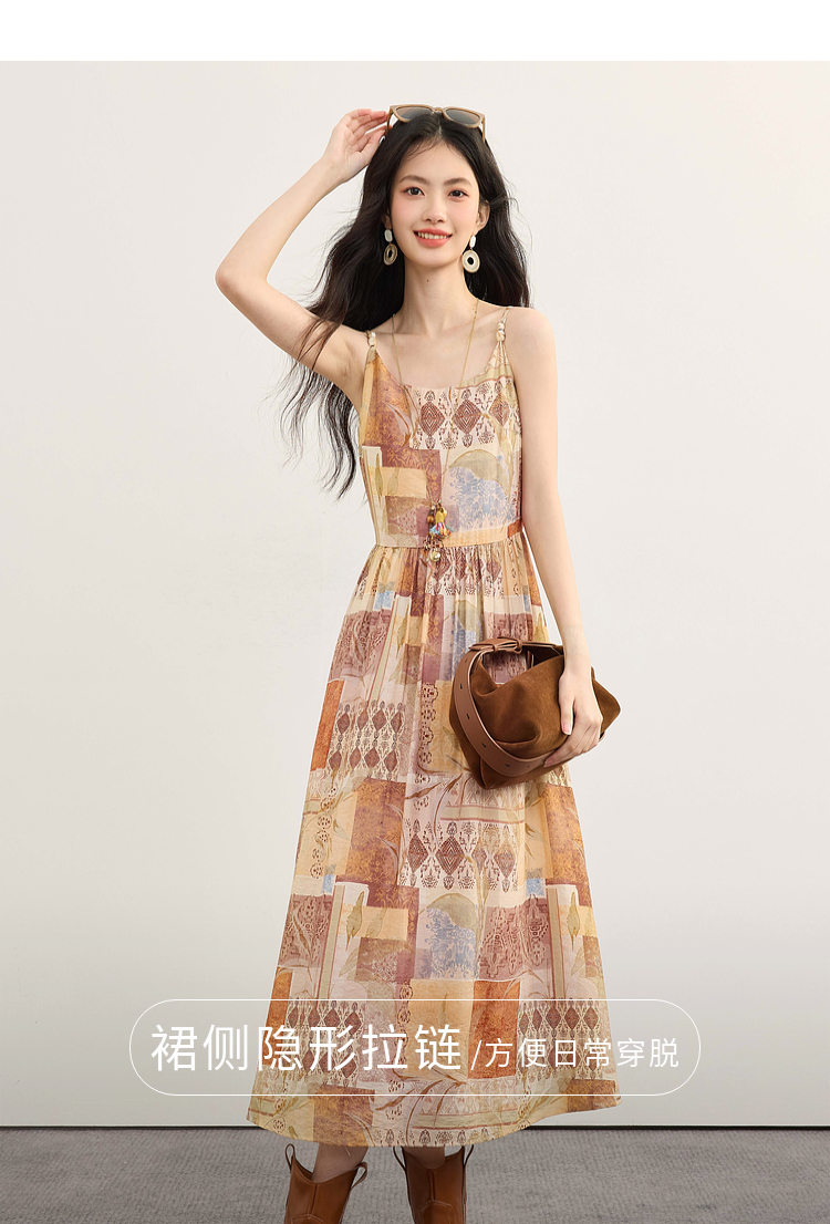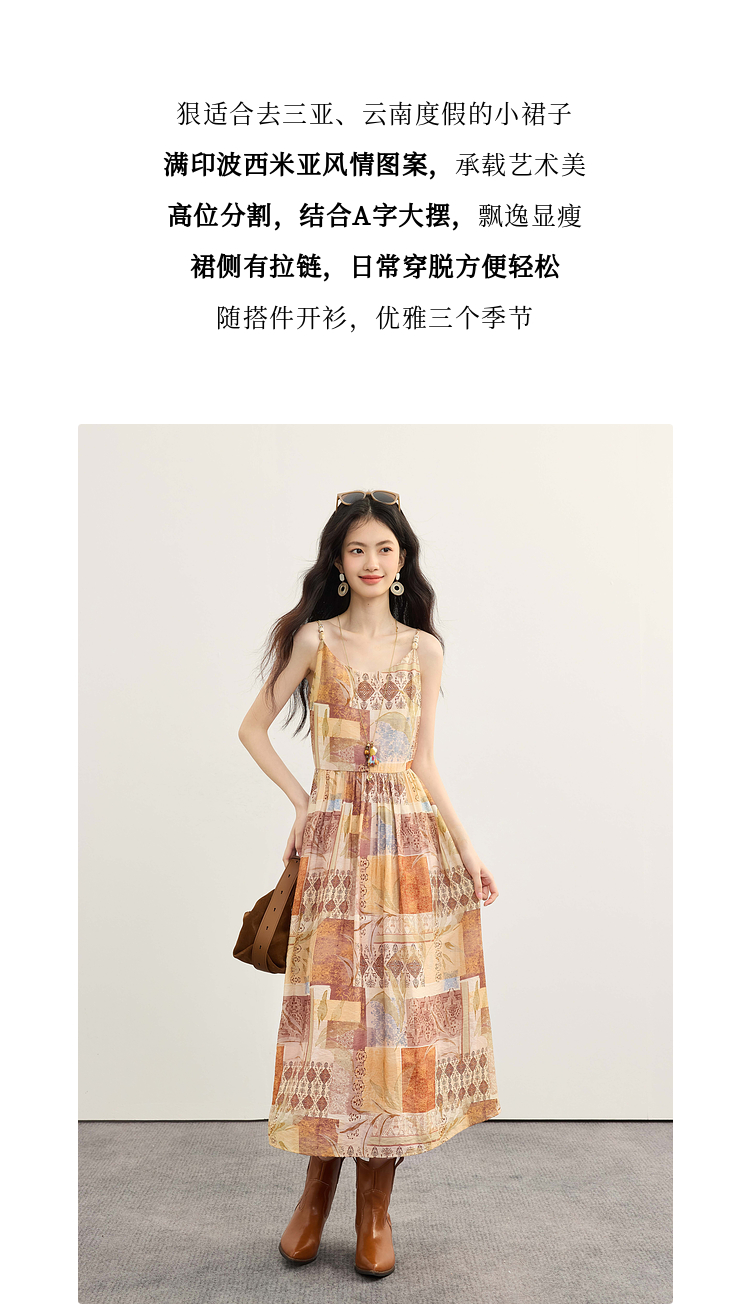 【08/06新品】熙世界波西米亚串珠吊带连衣裙女2025夏秋新款法式度假风印花长裙