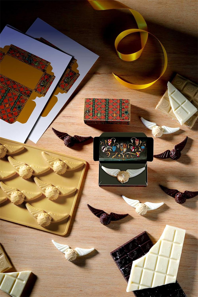 使用这款易于使用的巧克力金色飞贼套件,在厨房中创造属于您自己的魔法。随附的柔性模具由高品质、食品安全的硅胶制成,易于使用,并包含独特的孔,可根据哈利波特系列电影中的标志性物品制作八个金飞贼。该套件中还包括八个预印的模切盒子,其样式类似于魁地奇球衣箱,以确保您的自制巧克力飞贼以专业的方式交付!