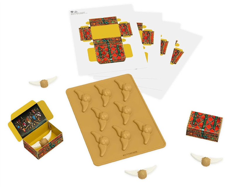 Create some magic of your own in the kitchen with this easy-to-use chocolate Golden Snitch kit. Made of a high-quality, food-safe silicone, the flexible mold included is easy to use and contains unique wells to make eight Golden Snitches based on the iconic item from the Harry Potter film franchise. Also included in the kit are eight pre-printed, die-cut boxes styled like Quidditch trunks, to ensure that your homemade chocolate Snitches are delivered with a professional touch!