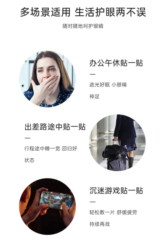 独立包装,方便携带,旅途、午休、睡前, 随时随地都可以放松 每天贴一贴,不仅缓解眼睛疲劳, 还可培养护眼意识,将护眼养成习惯!