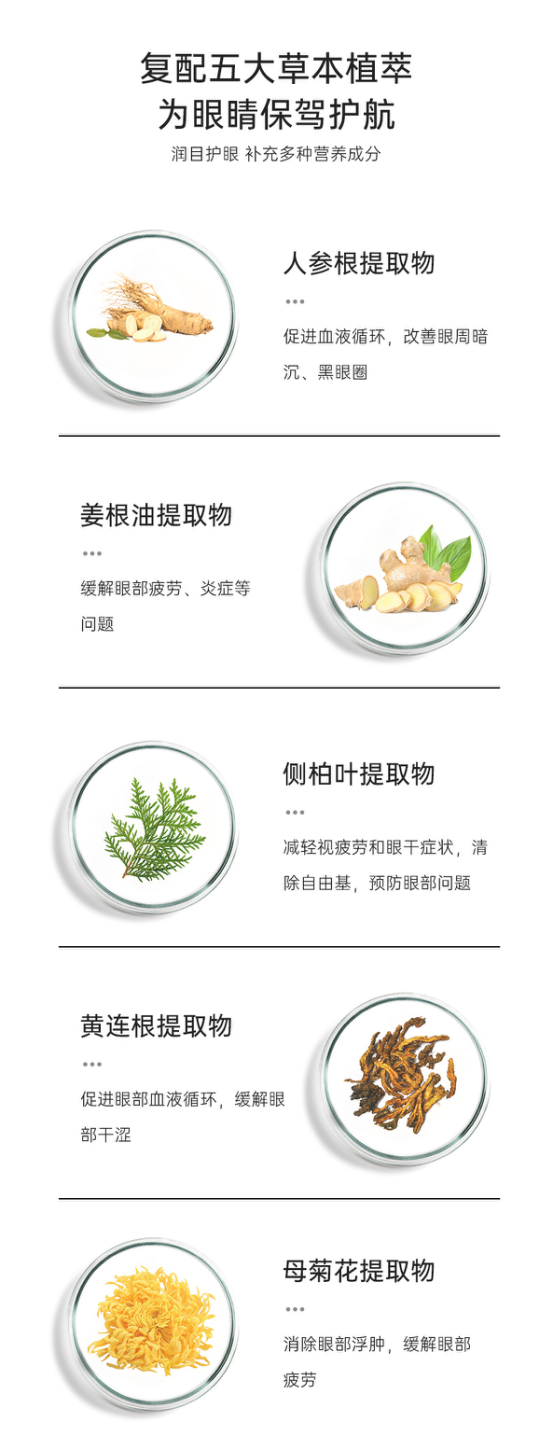 【主要原料】水、甘油、人参根提取物、姜根油、侧柏叶提取物、叶黄素、黄连根提取物、母菊花提取物、薄荷脑等成分