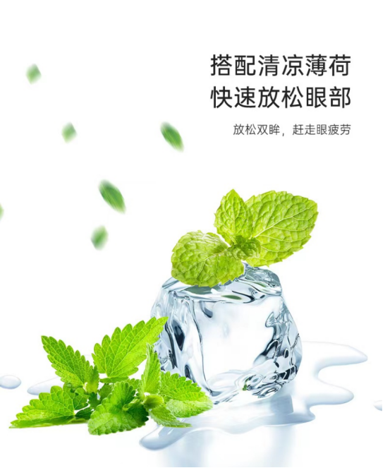 冷敷、遮盖、渗透,一步到位, 眼角周围冰凉凉的安心又舒适,有效舒缓眼疲劳 8-25分钟敷完后重新睁开眼睛,感到焕然一新的明亮、清爽, 就像给眼睛做了一次深层的天然沐浴
