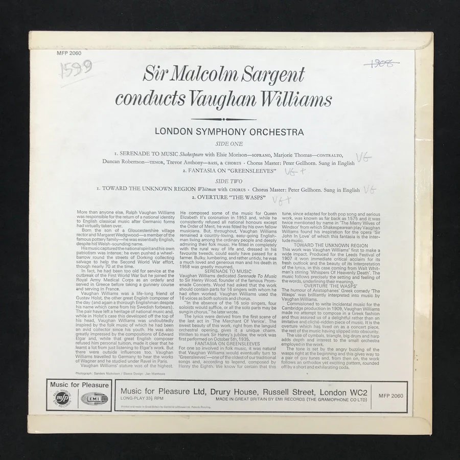LP黑胶唱片 马尔科姆·萨金特指挥沃恩·威廉斯作品《小夜曲》《绿袖子幻想曲》《黄蜂》等 伦敦交响乐团厂牌:Music For Pleasure