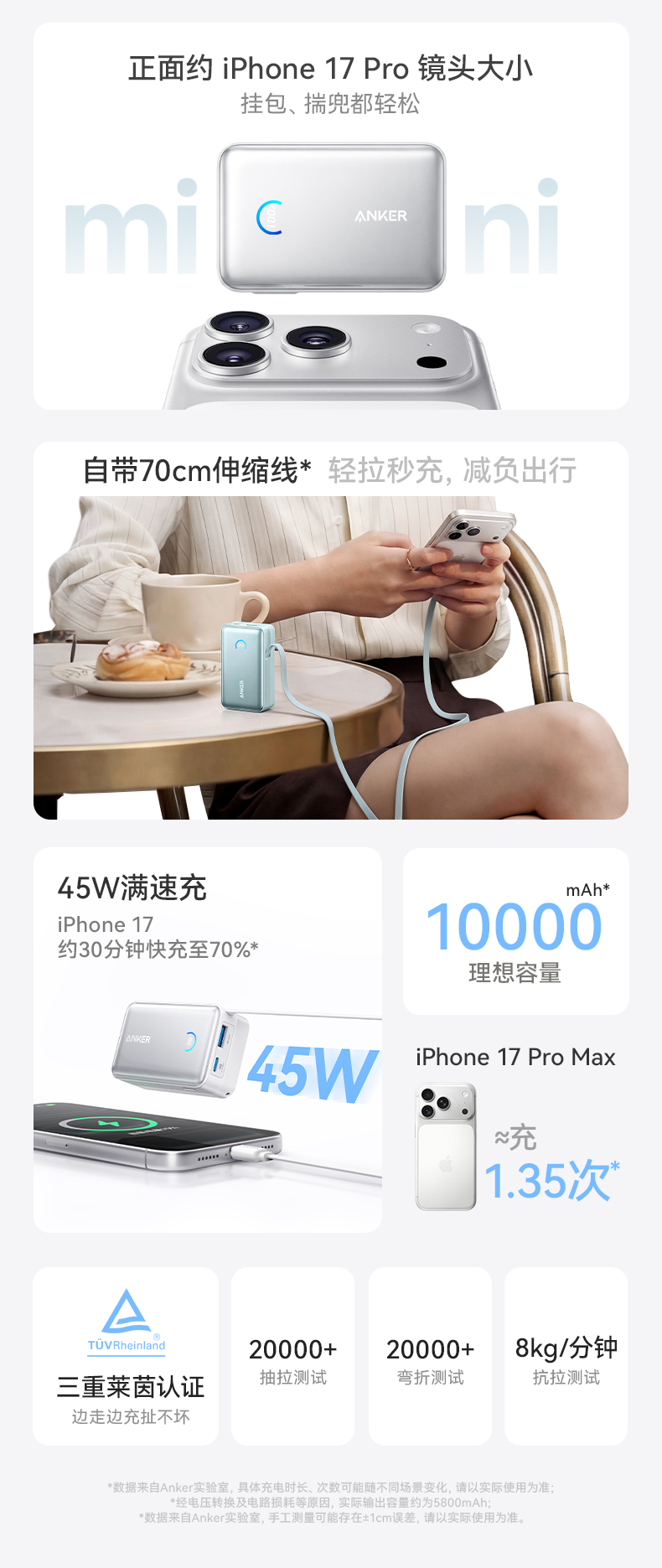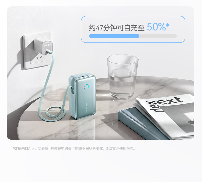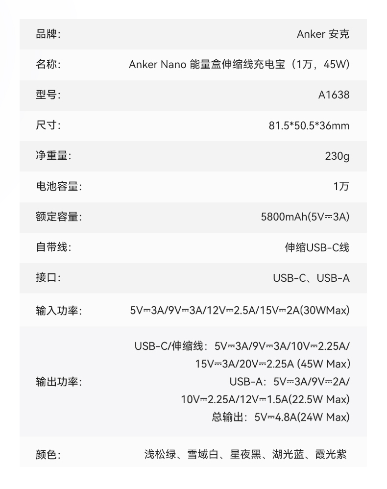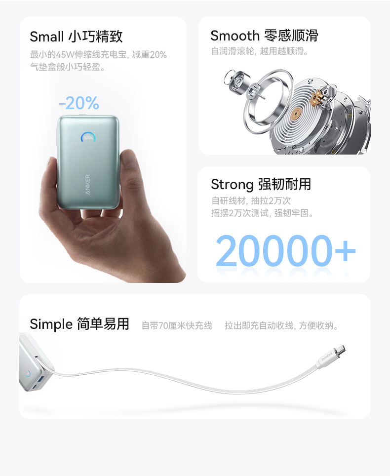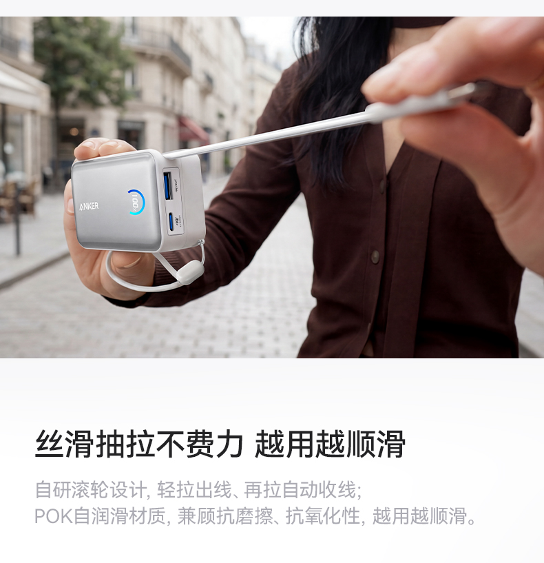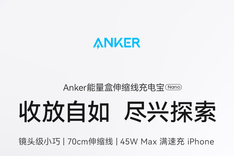 Anker安克 45W自带伸缩线能量盒充电宝 10000mAh 适配苹果手机飞机可携带 A1638
