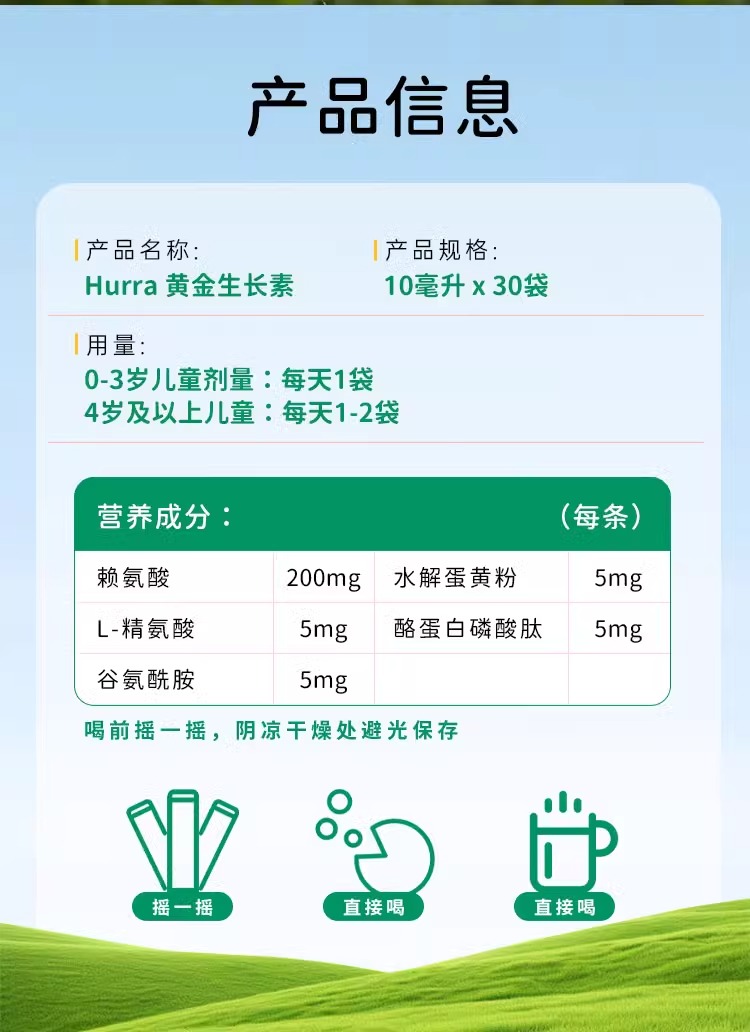 【新品首发】Hurra黄金条赖氨酸儿童青少年生长氨基酸黄金生长素