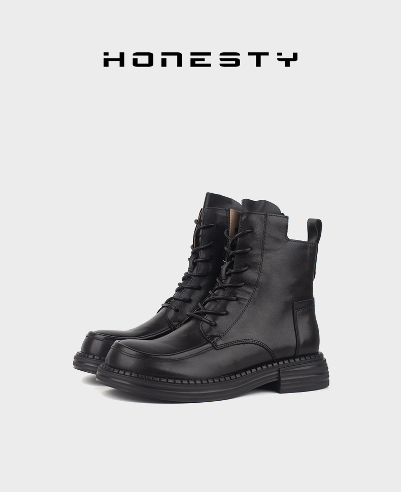 和诚行 2023秋冬新款英伦系带真皮短筒靴女厚底增高马丁靴1930054