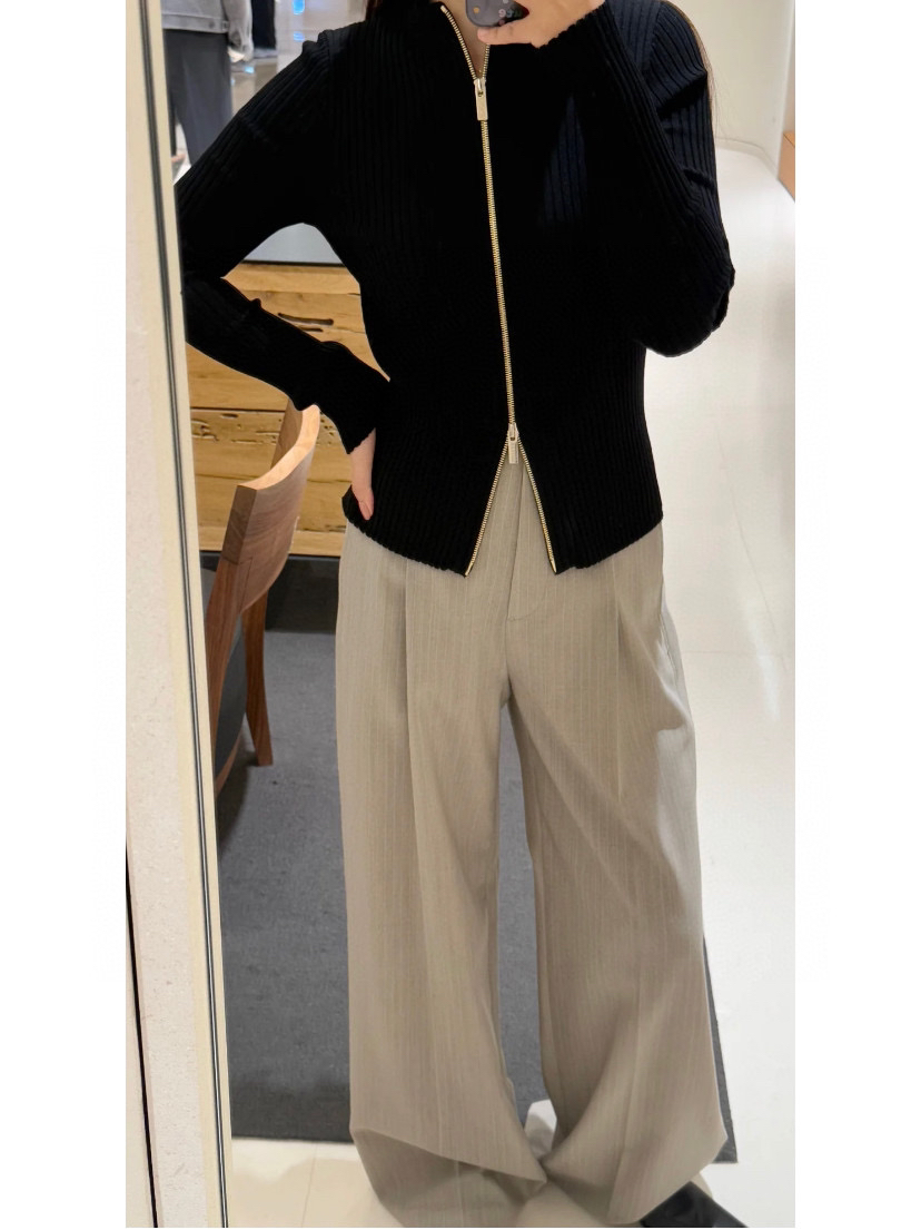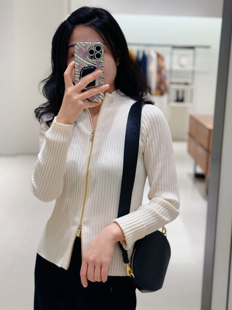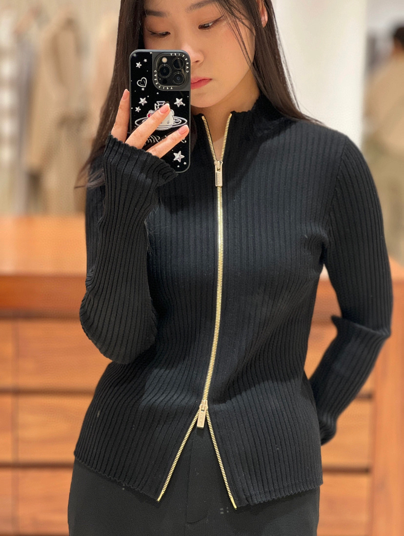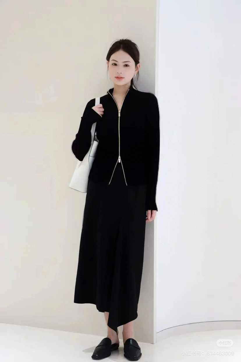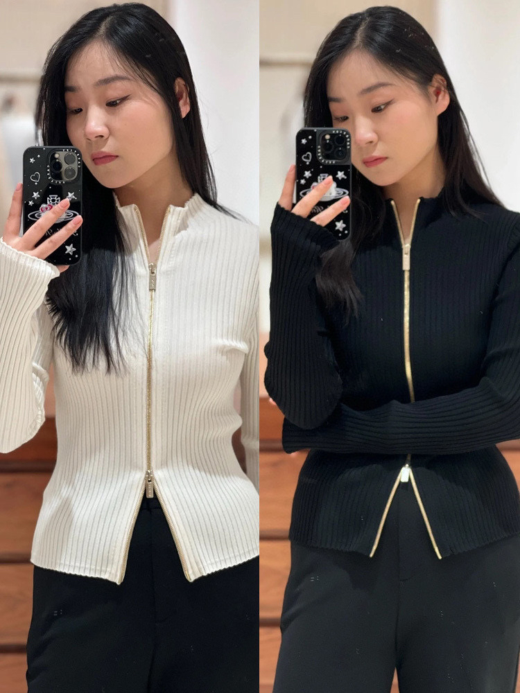 穿着舒适自在无束缚感,质地比较轻盈,贴身穿炒鸡炒鸡舒服,黑色真的显瘦一个号。打破针织衫和开衫界限,双开拉链丰富时髦度,金属色拉链存在感很强,点睛[爱心]