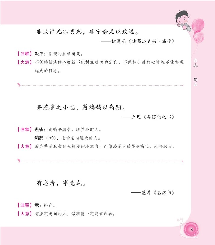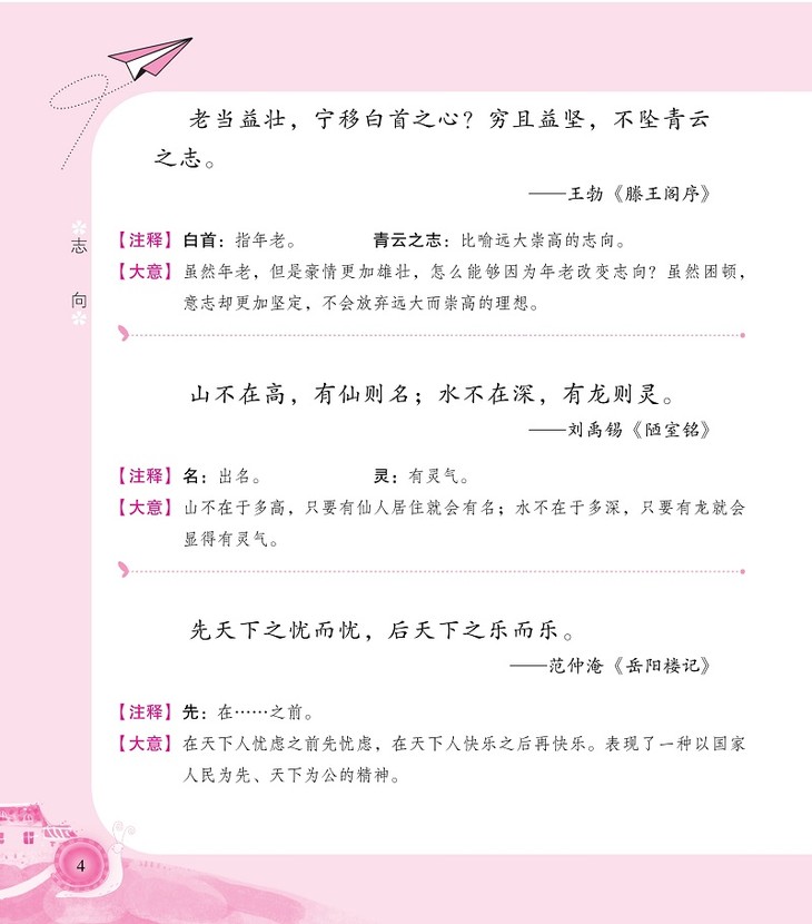 本书以小学生语文新课标附录中提供的古诗词为基础,精选并适度扩展,收录300多条的小学生必须掌握的诗文名句,整理分为两大类:古文篇和诗词篇,并根据所选名句在阅读和写作中的功能再次细分。所选名句均为千古流传的经典,包括有关学习、立志、为人处世等丰富主题,同时涉及大量典故和成语。这本书收录内容丰富,分类合理,兼顾知识性和功能性。不仅可以作为小学生语文阅读和写作的参考书,也可以作为丰富语文知识的课外书。