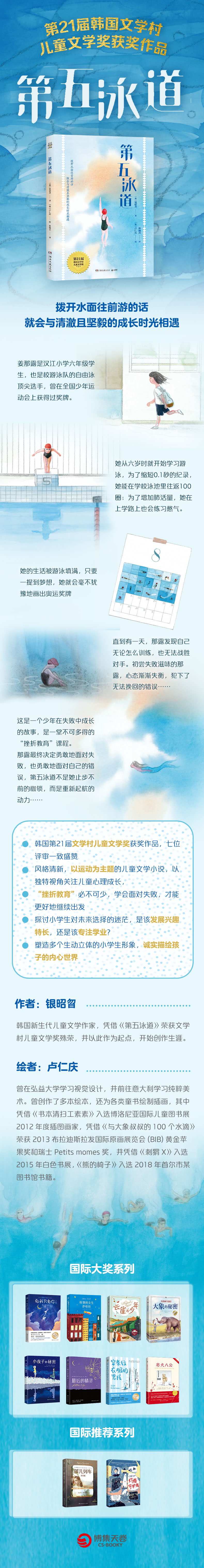 姜那露是汉江小学六年级学生,也是校游泳队的自由泳主力选手。她从小就开始学习游泳,比任何人都更努力、更刻苦,然而有一天强有力的对手出现在面前,无论那露怎么拼命也无法战胜。初次品尝到屡战屡败滋味的那露,心态终于失衡…… 这是一个少年在不断的竞争与失败之中获得成长的故事,为了证明汗水的价值,为了不做逃兵,那露比任何人都更加努力。然而一意前行的她却忘记了偶尔停下脚步,审视自己的内心。最终,在朋友和家人的陪伴鼓励之下,那露渐渐体会到失败对于成长的意义,自己所在的“第五泳道”不是停滞不前的地方,而是重新站起来的前进踏板,是成长的地方。