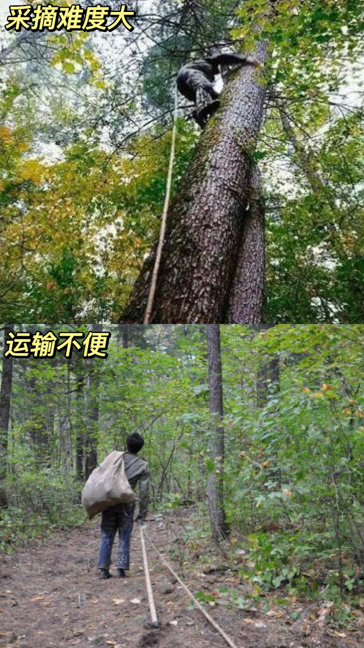 因为松塔都长在很高的地方,工人需要爬上,每一次打落的松塔量都不算大,而且随时有可能跌落,所以采摘松子的人工成本很高