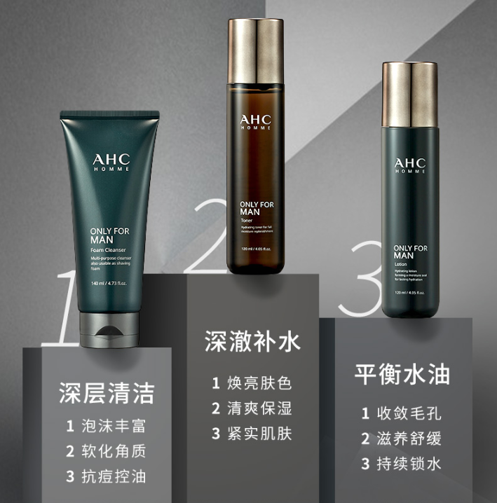 【品牌授权】AHC男士水乳洁面3件套装 旅行装 体验装 洗面奶140ml+爽肤水120ml+乳液120ml