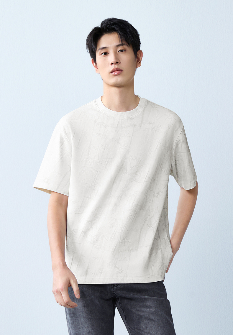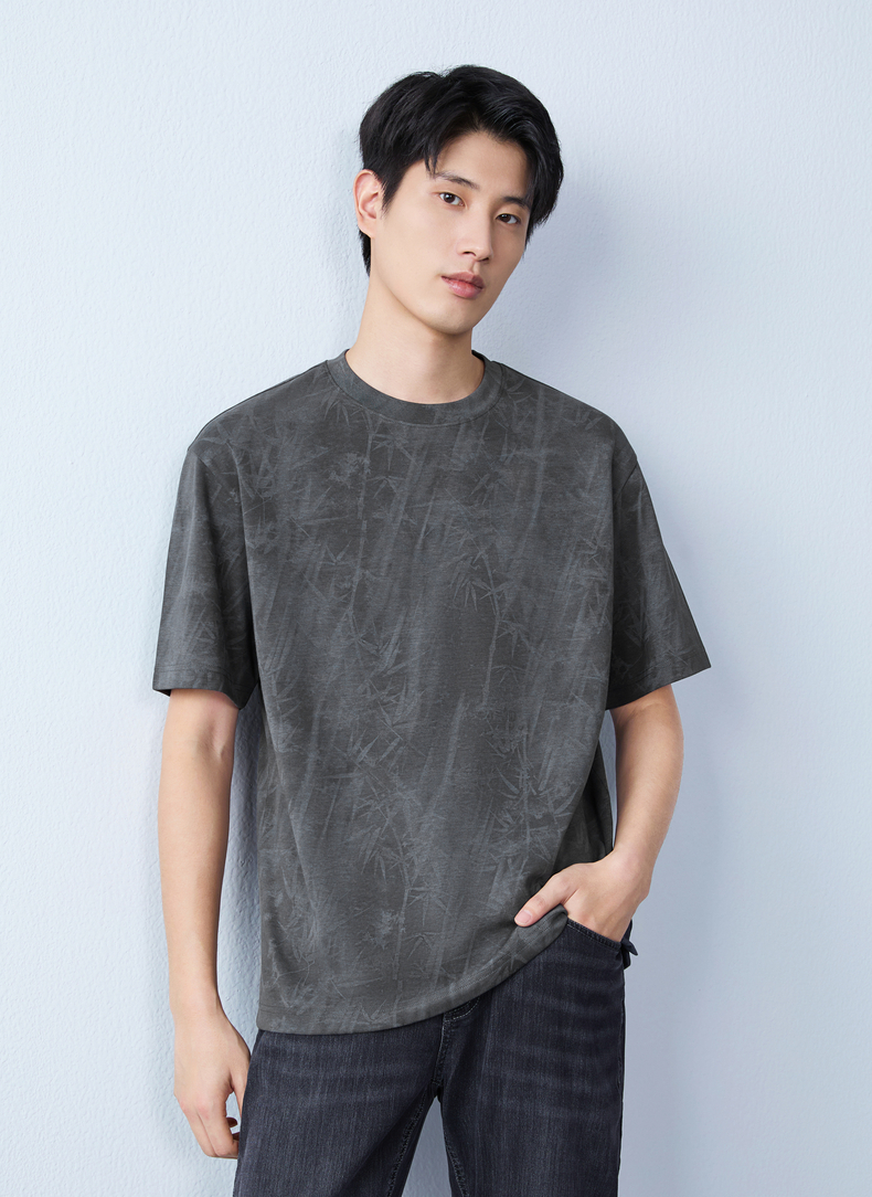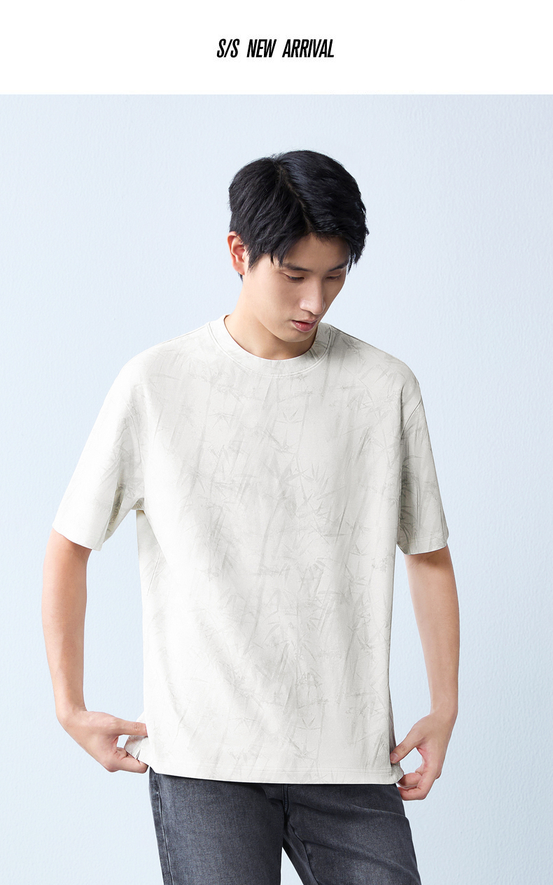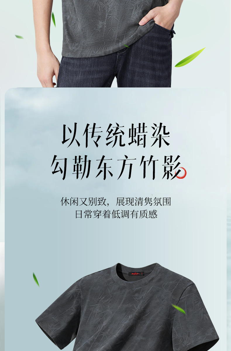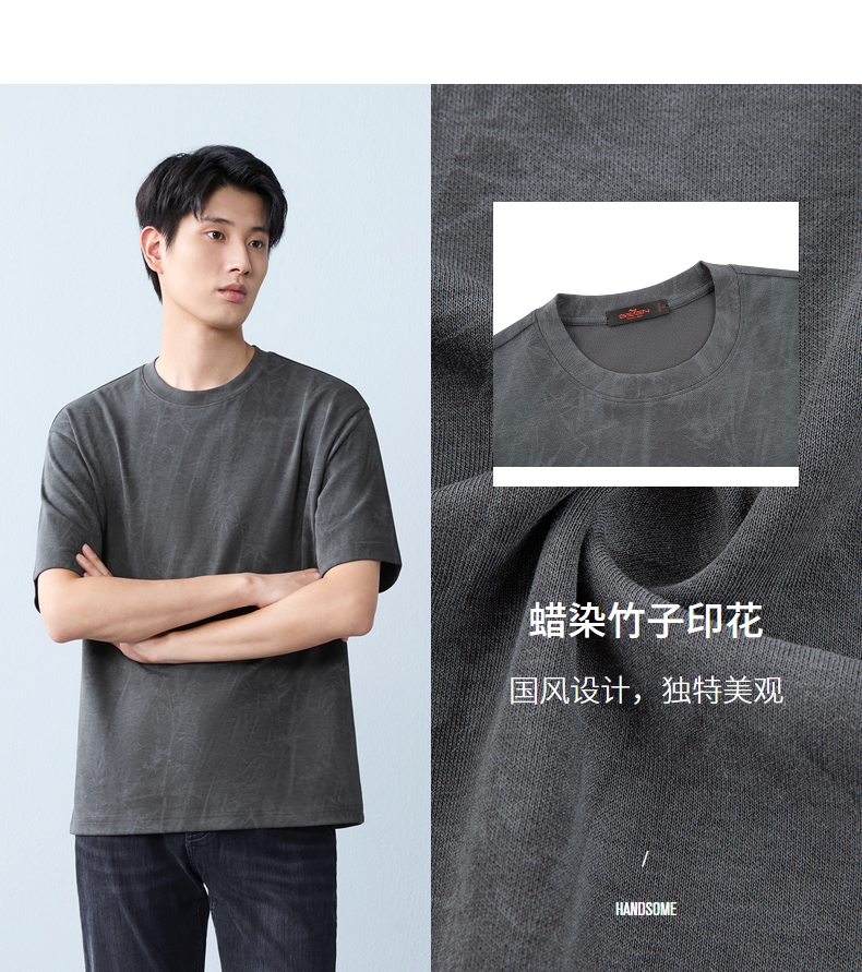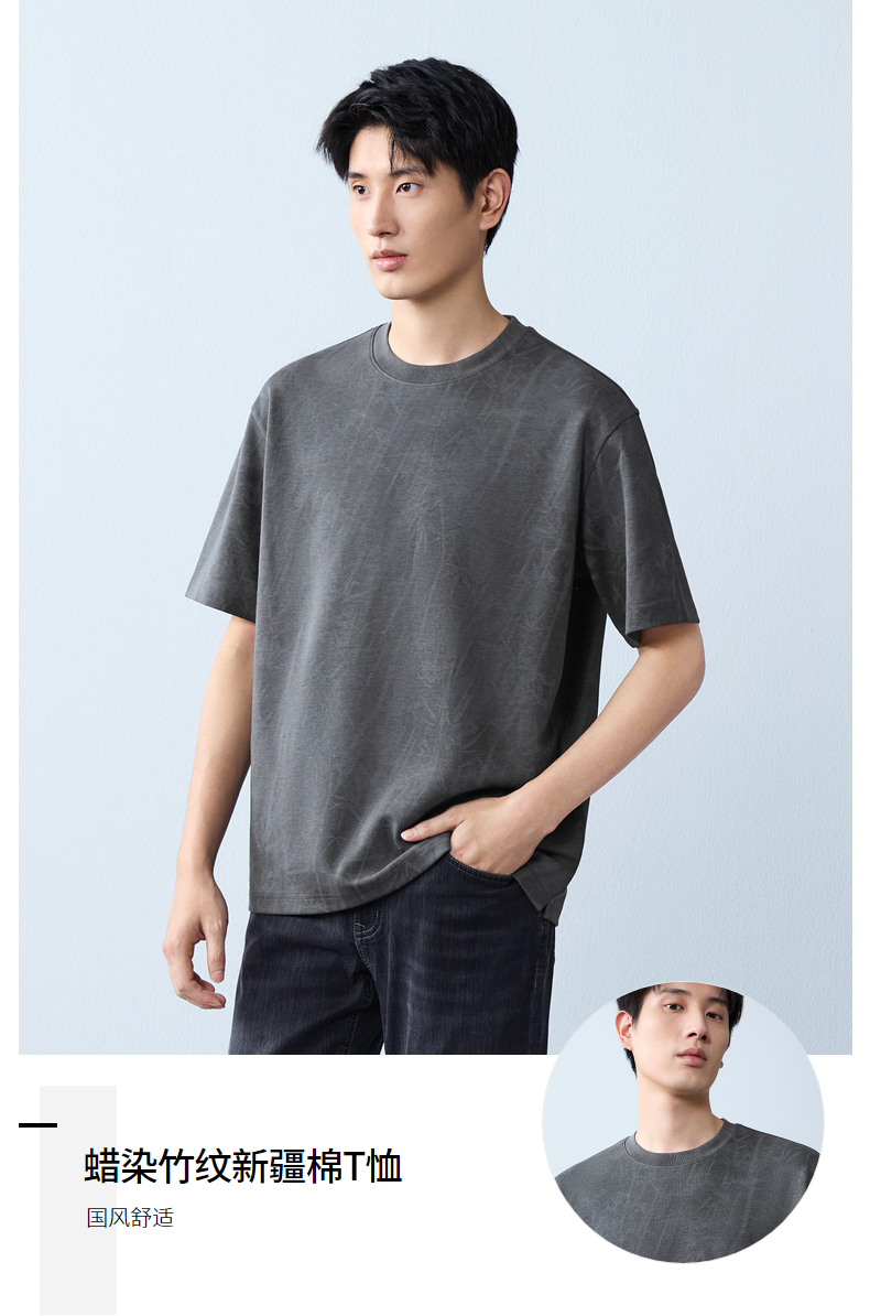 【蜡染T恤】柒牌男装2026夏季圆领宽松国风竹纹印花新疆棉短袖T恤 130T72340