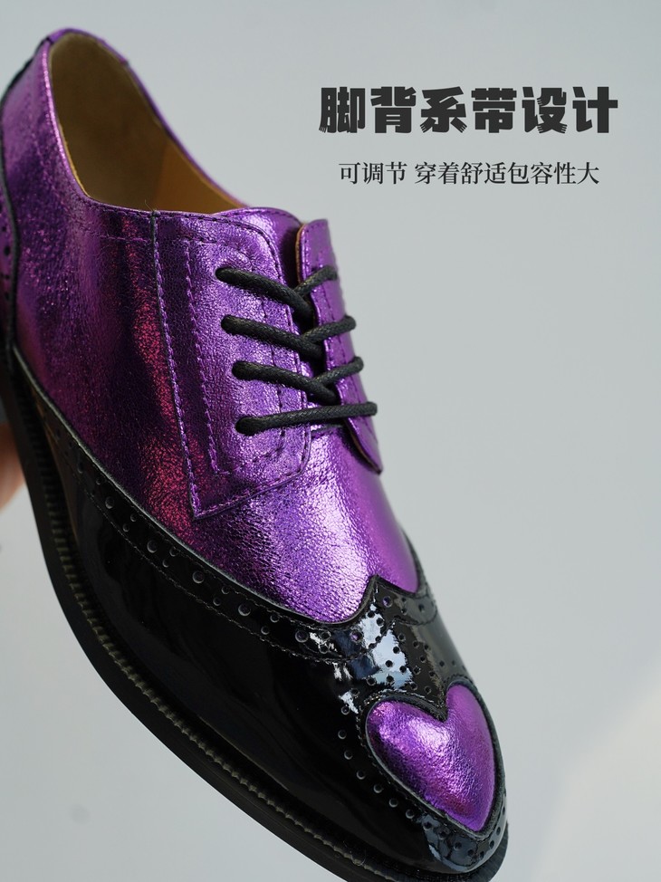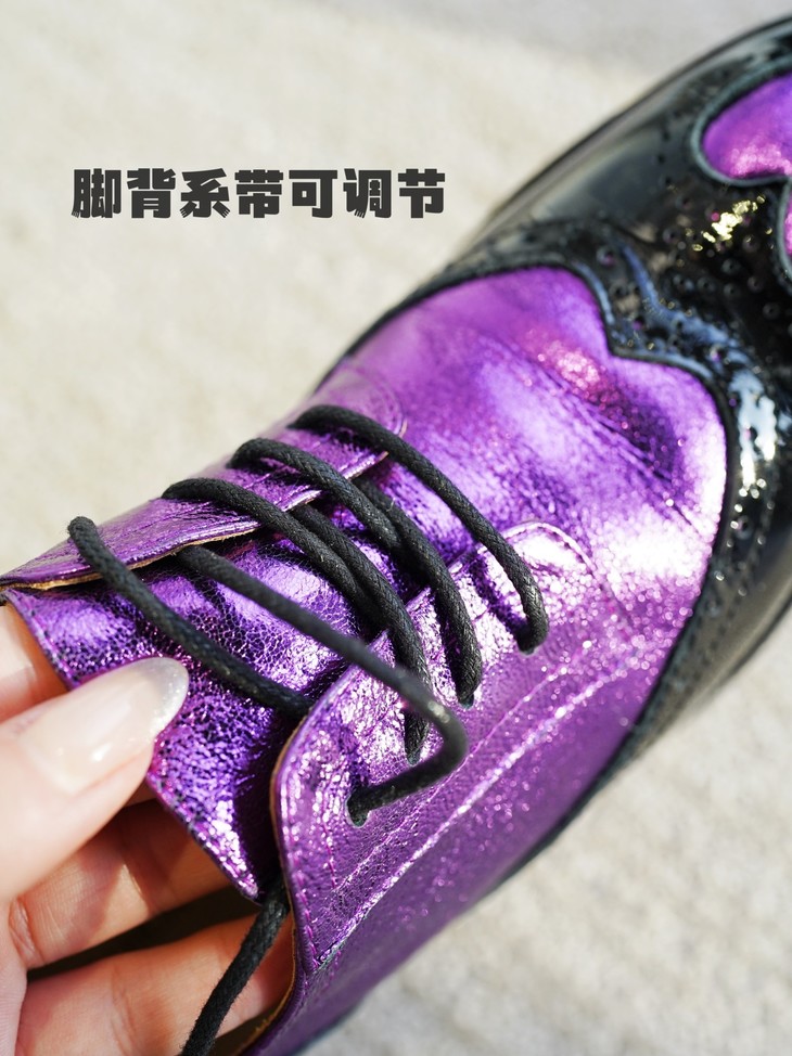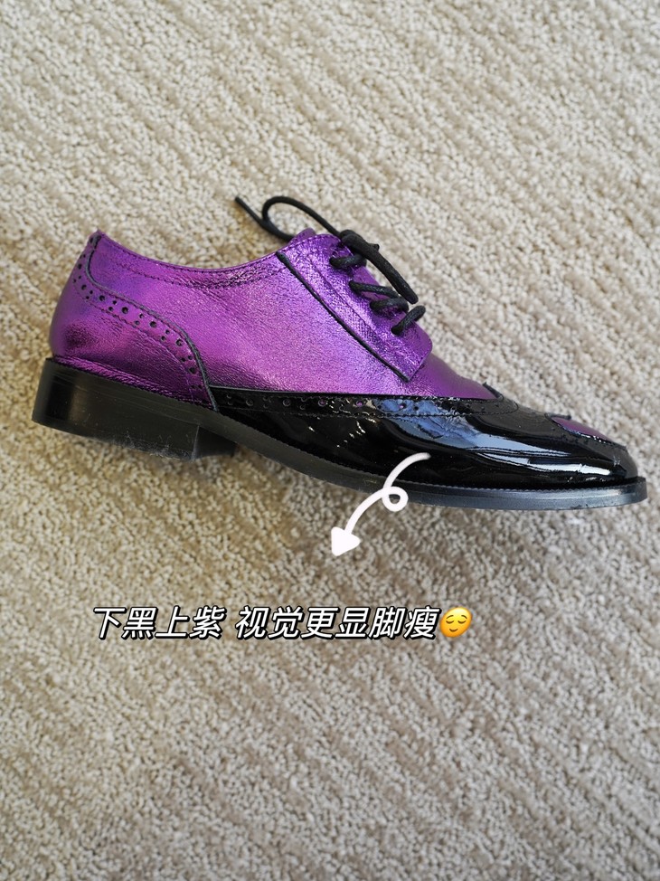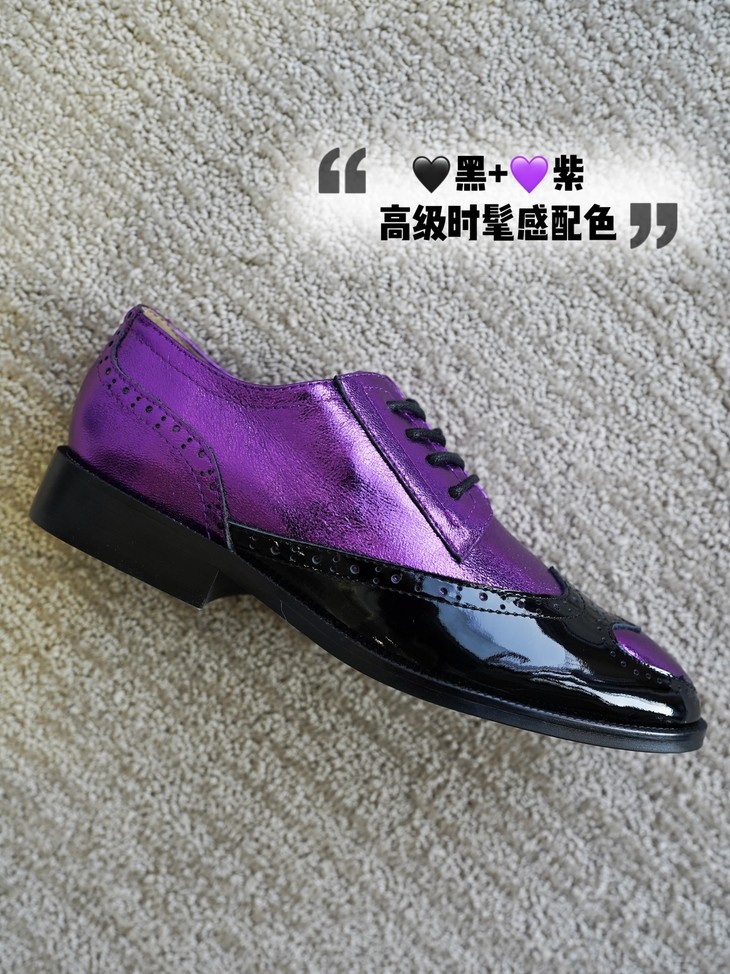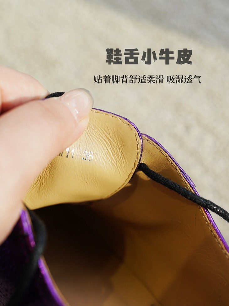 鞋面皮料看着是不是很篙级很特别?这双鞋是我们黑金牛油皮鞋同一家工厂做的2024春季新款!鞋面紫色的部分是现在的新型金属褶皱工艺,用羊皮做的!就跟我们春夏天出的金皱牛皮黑金玛丽珍类似的工艺,这家工厂更是用的羊皮👍