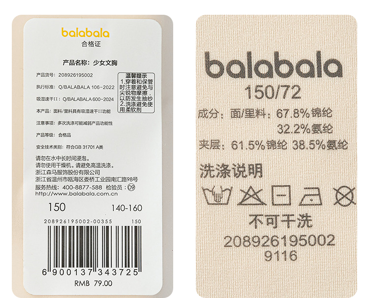 巴拉巴拉女童内衣发育期儿童小背心文胸防凸点防走光纯色吸湿速干