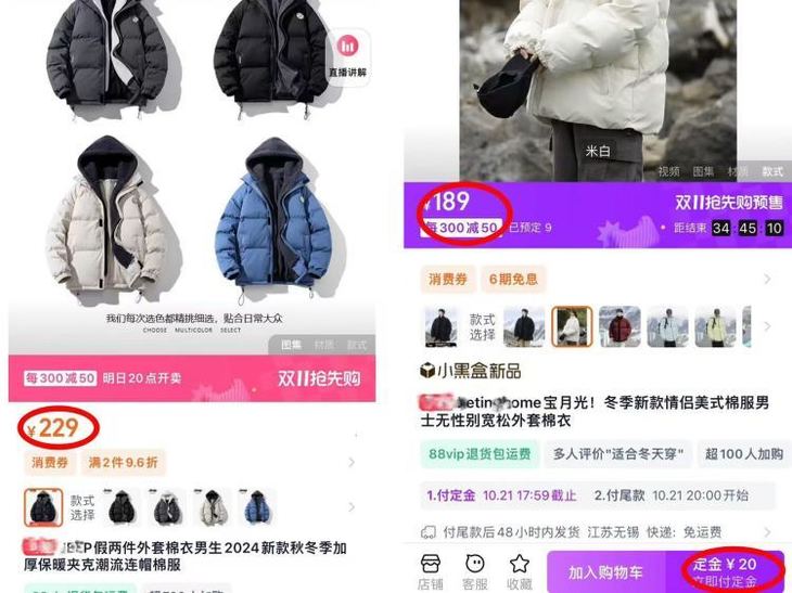 双十一同类型棉服活动券后还要200左右,还要凑满减付定金预定,今天只要89 就能拿下!