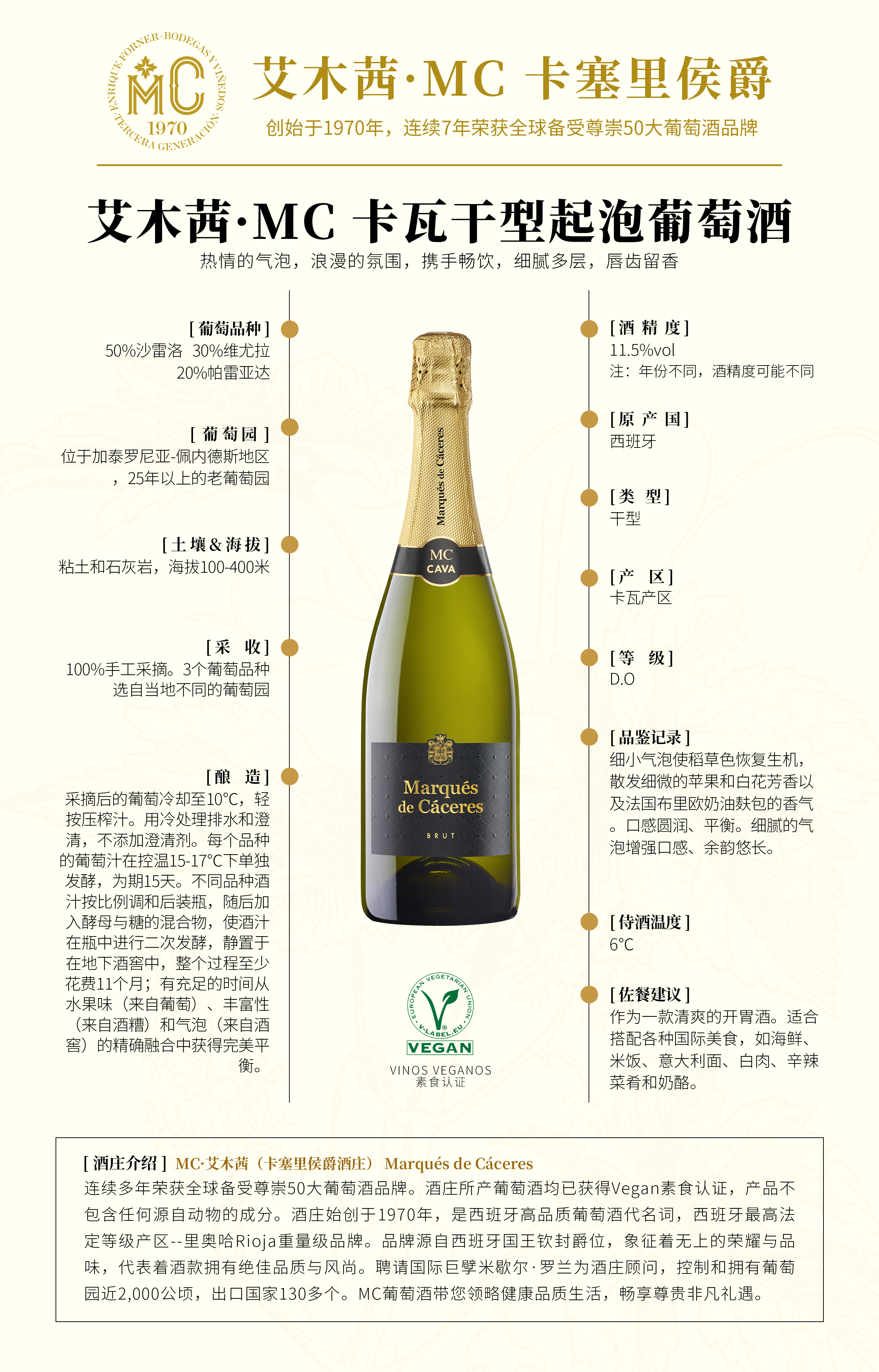 镇场专属【MC卡塞里侯爵】CAVA卡瓦起泡干白葡萄酒 百年名庄全球50大葡萄酒品牌之一 西班牙原瓶进口 DOC等级香槟起泡酒 750ml 偏远地区不发或请询客服