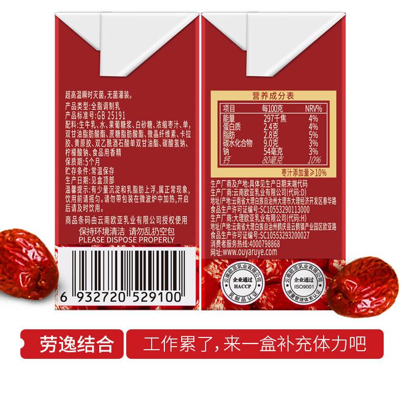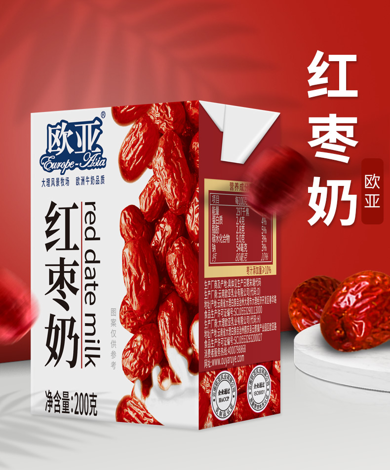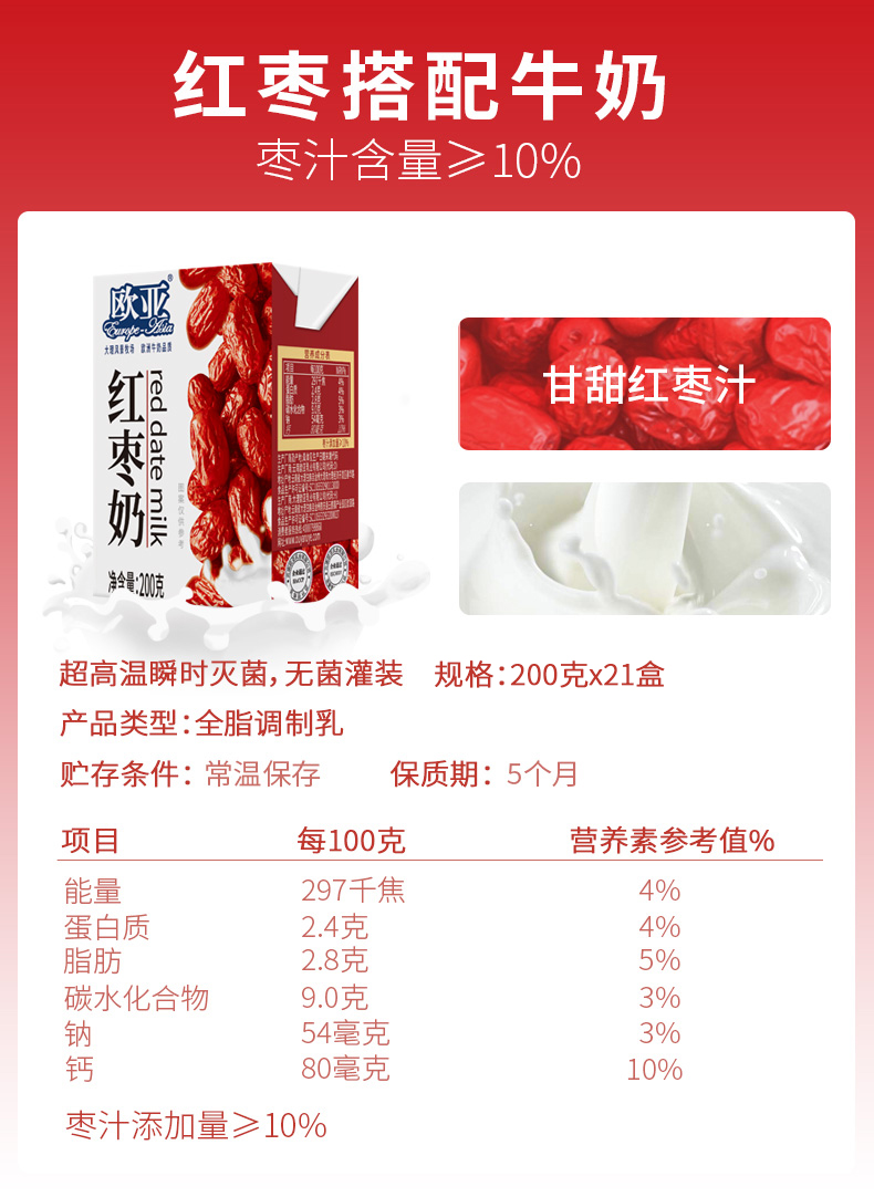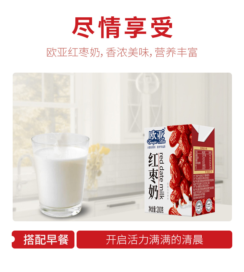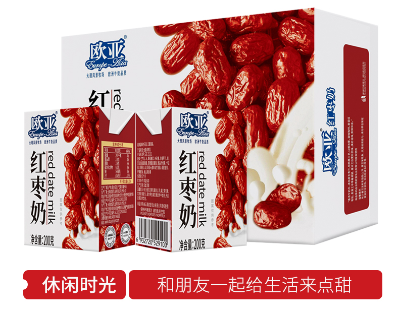 【日期新鲜】欧亚牛奶红枣奶200g*21盒/箱