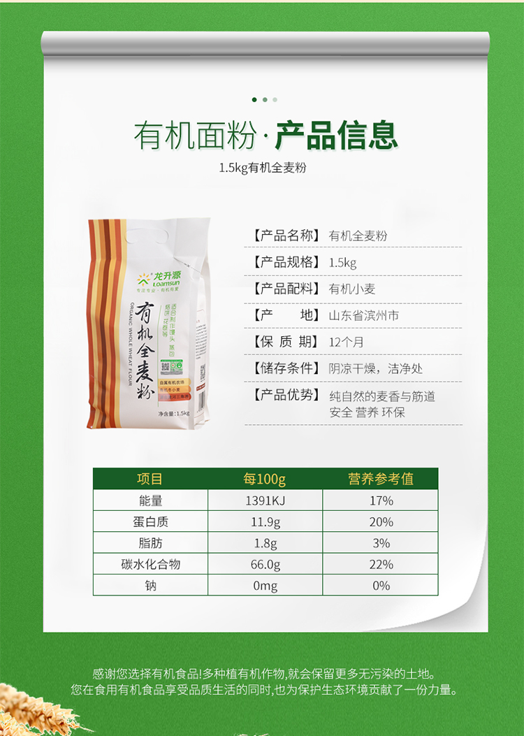 龙升源有机全麦粉1.5kg/袋