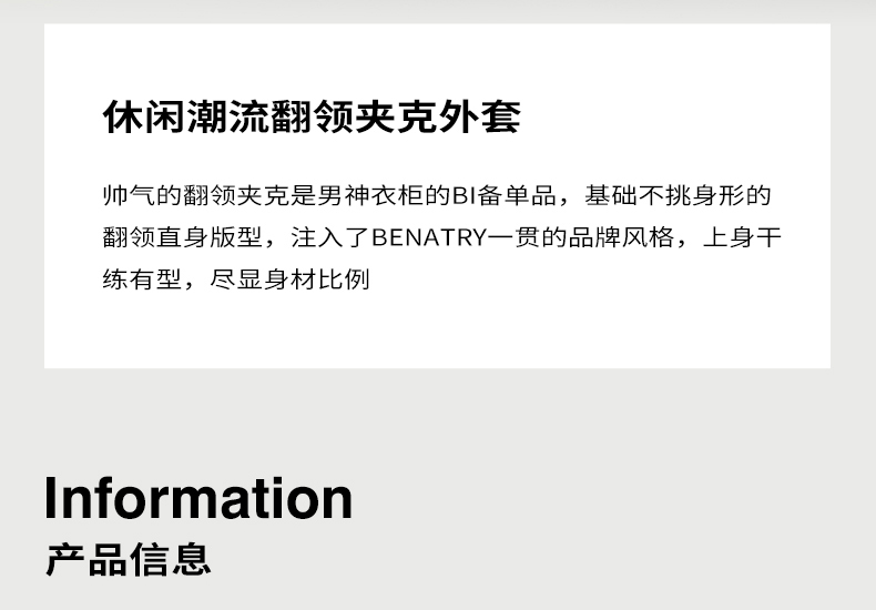 - 贝纳川男装致力于为不盲目追随潮流,坚持自己风格,注重细节与配饰搭配的而立之年轻熟男打造时髦、简约、轻松、真实的着衣风格。