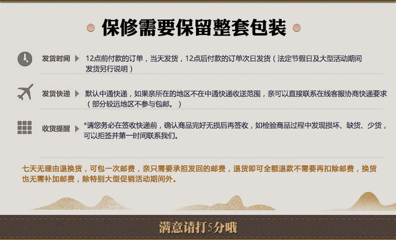 2.每天下午17:30统一 发货,国定节假日休息。