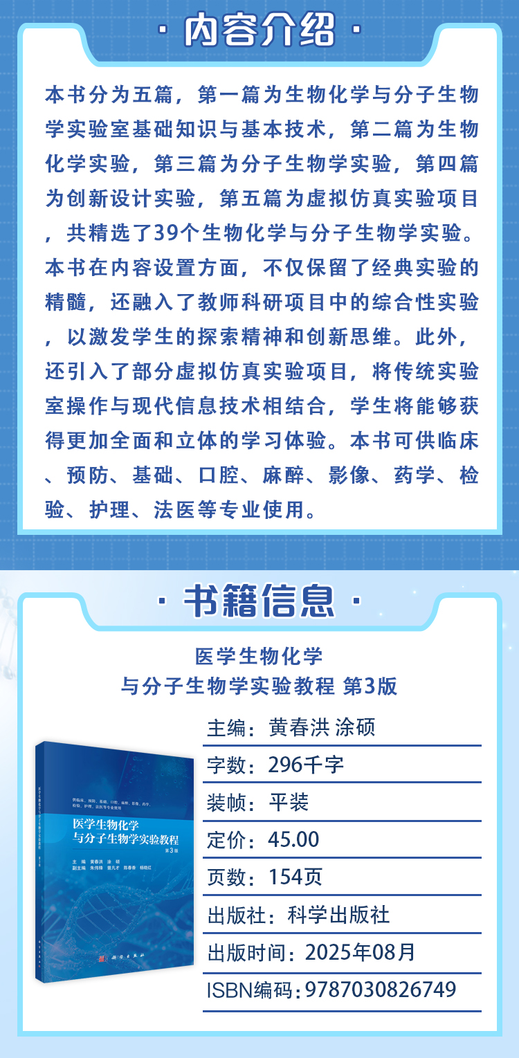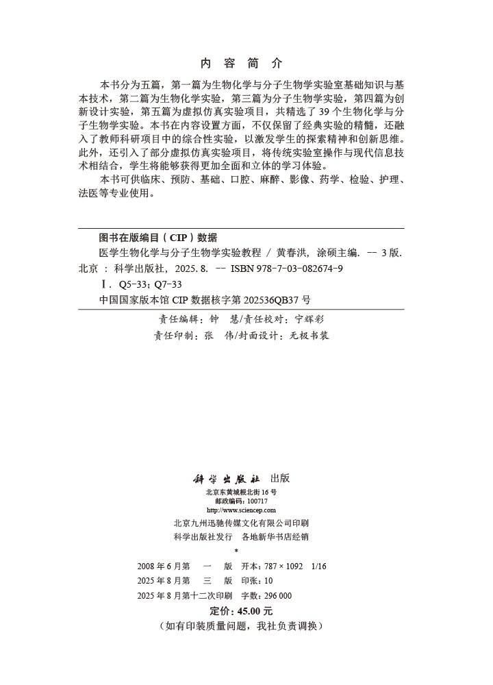医学生物化学与分子生物学实验教程 第3三版 黄春洪 涂硕 主编 供临床预防基础口腔麻醉影像药学检验护理法医等专业使用科学出版社