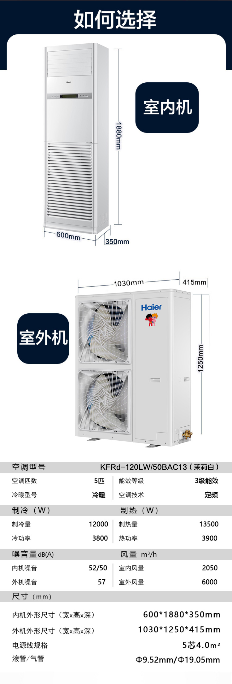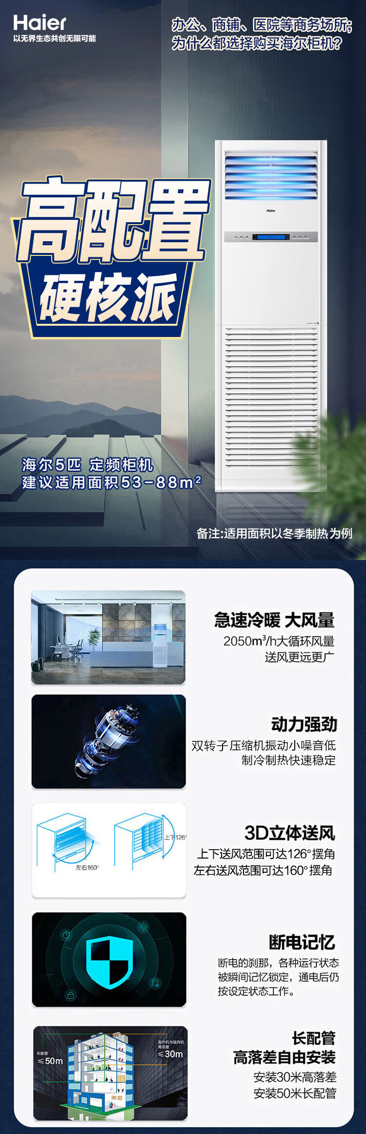 海尔中央空调5匹定频商用柜机380V冷暖新能效KFRd-120LW/50BAC13(茉莉白)京配 包4米安装