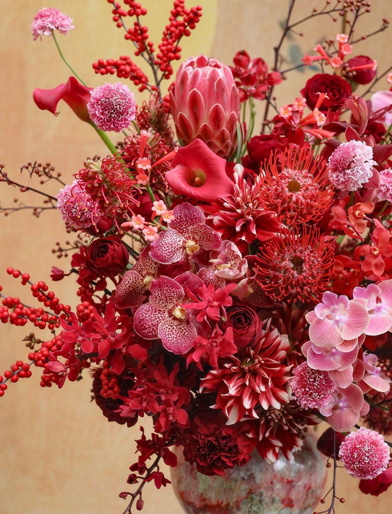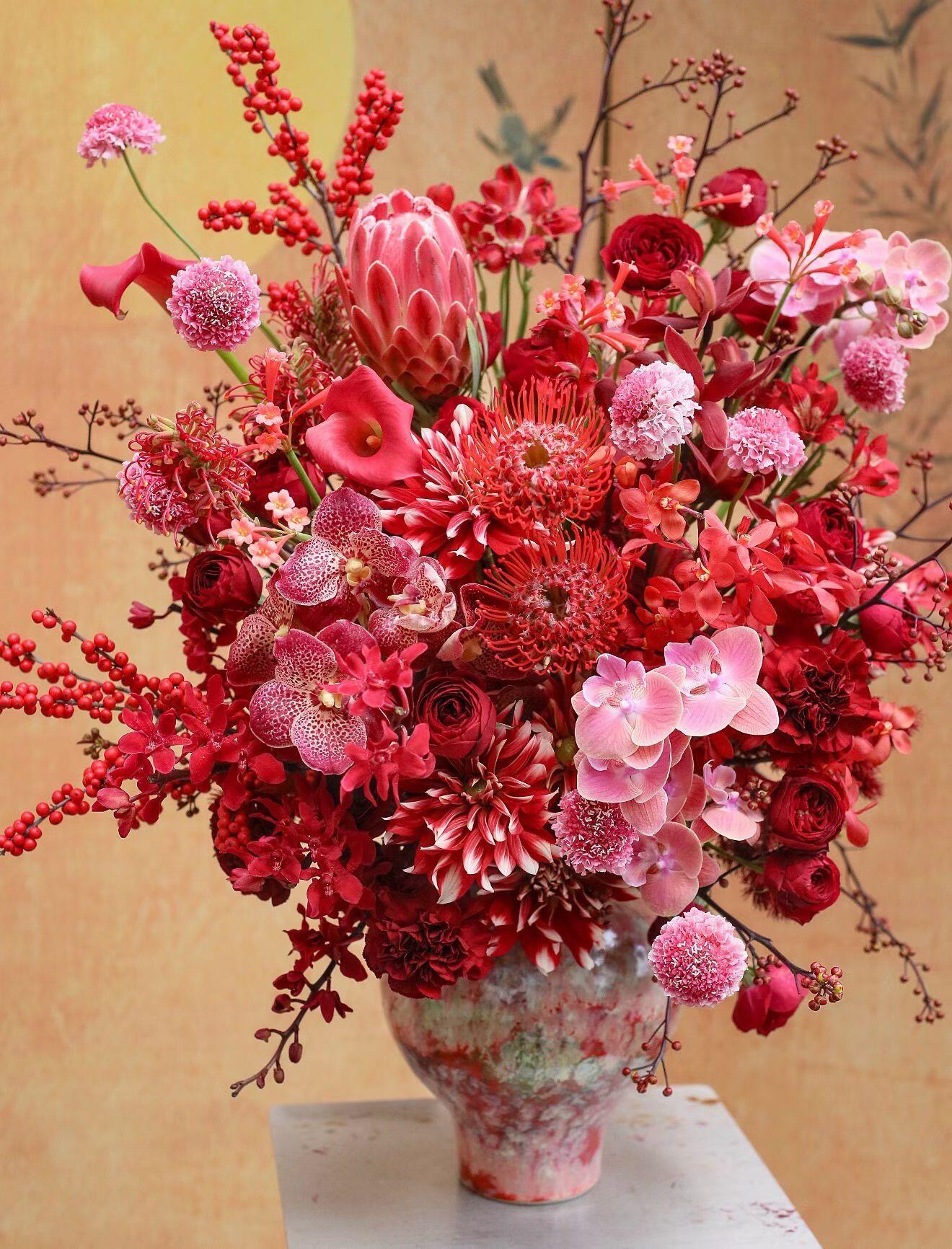 《丰盈福满》南非针垫北美冬青公主蝴蝶兰胡姬兰红蕾丝粉彩花瓶瓶插花