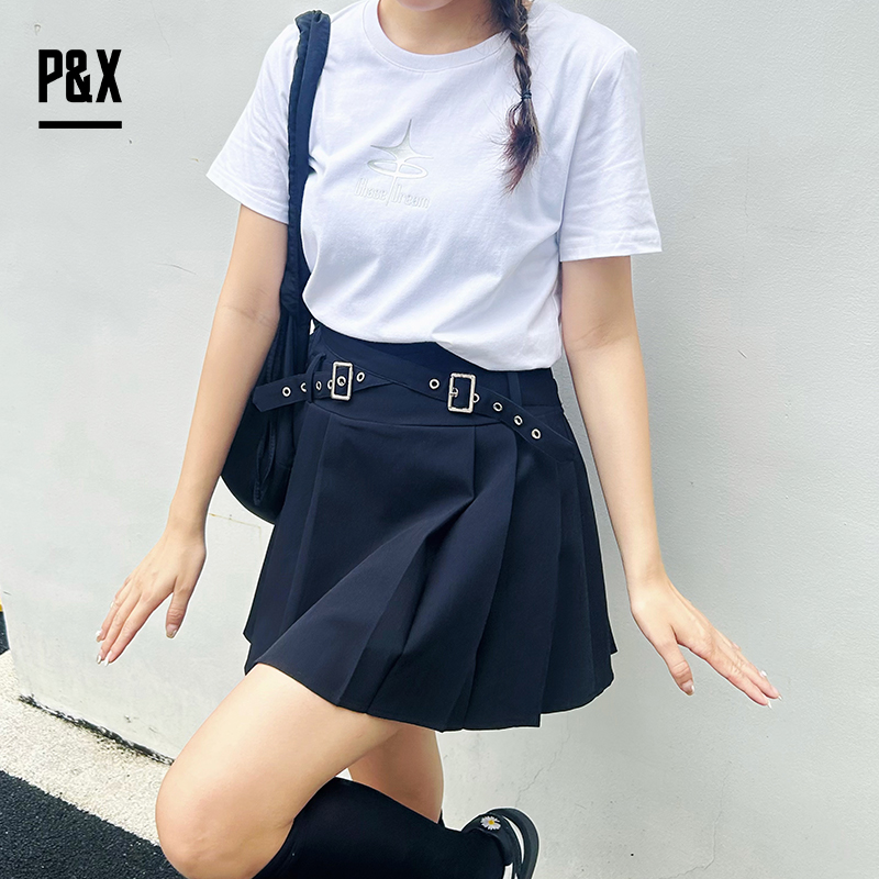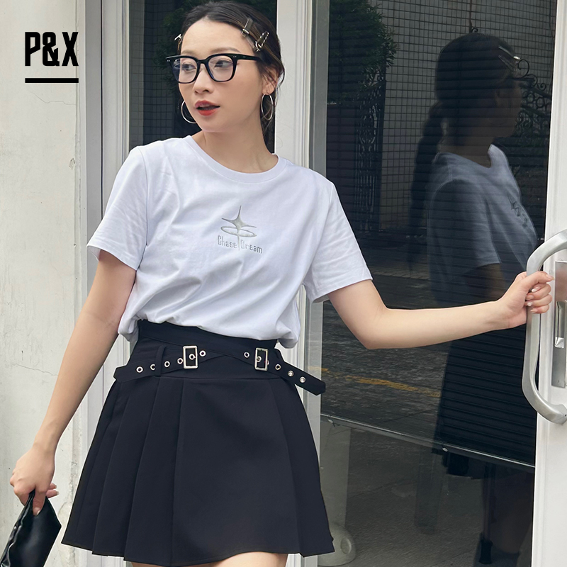 P&X设计师女装2025秋季街头风圆领短款T恤拼接825302208 黑色