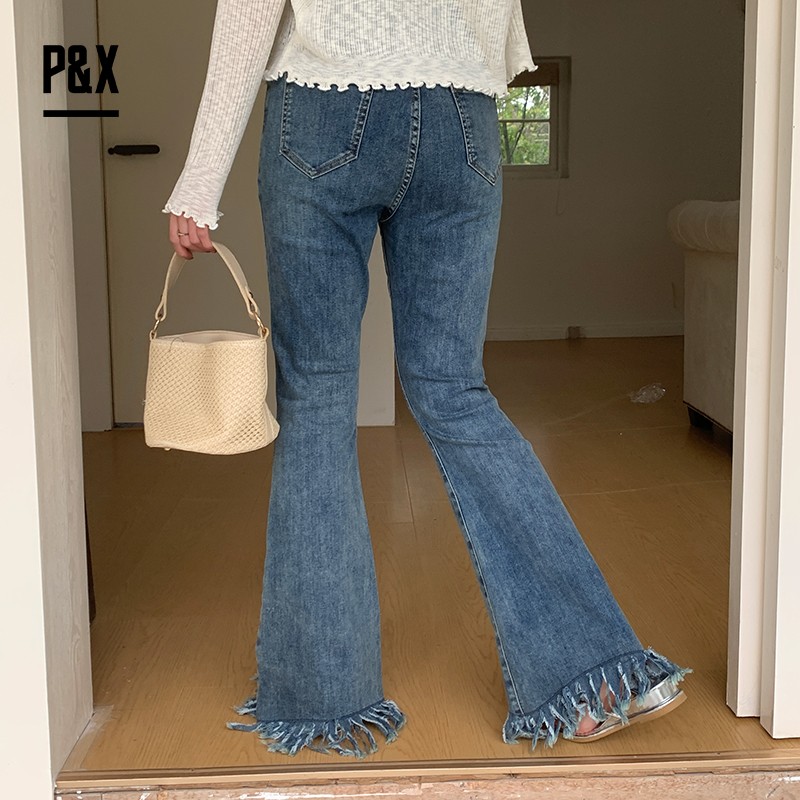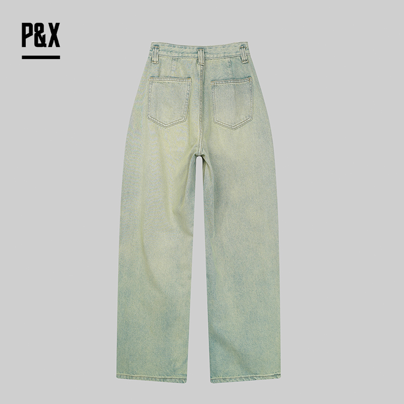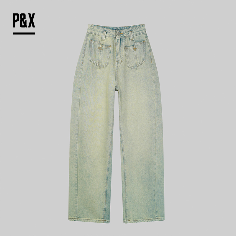 P&X设计师女装 美式潮流复古做旧牛仔裤宽松阔腿裤825110063 蓝色