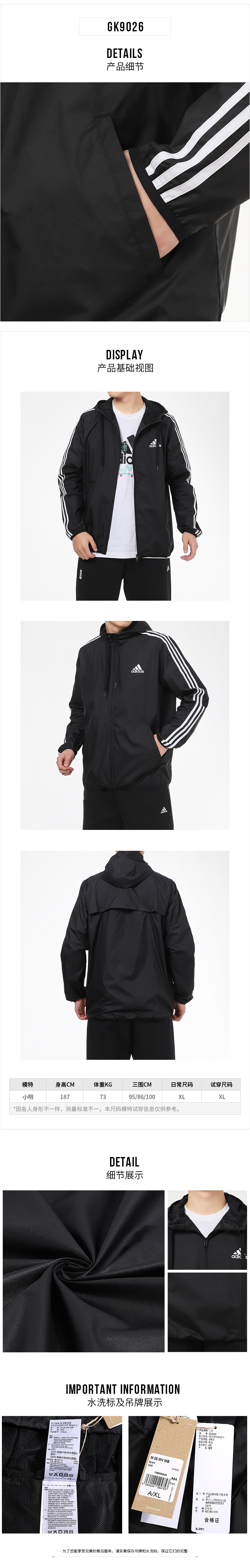 Adidas阿迪达斯防风衣男连帽春秋季运动衣服轻薄健身休闲夹克外套GK9026