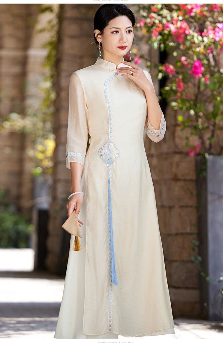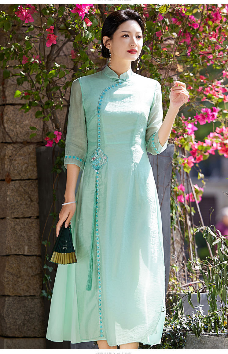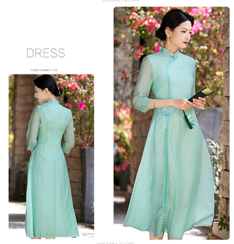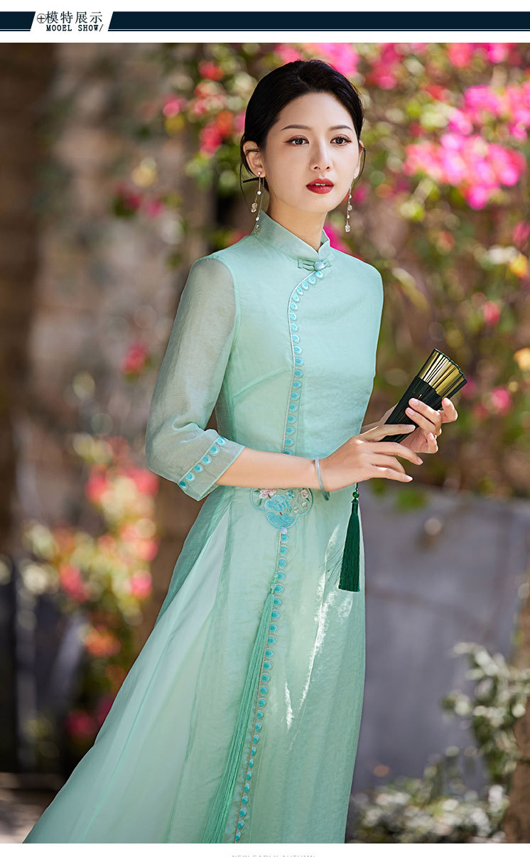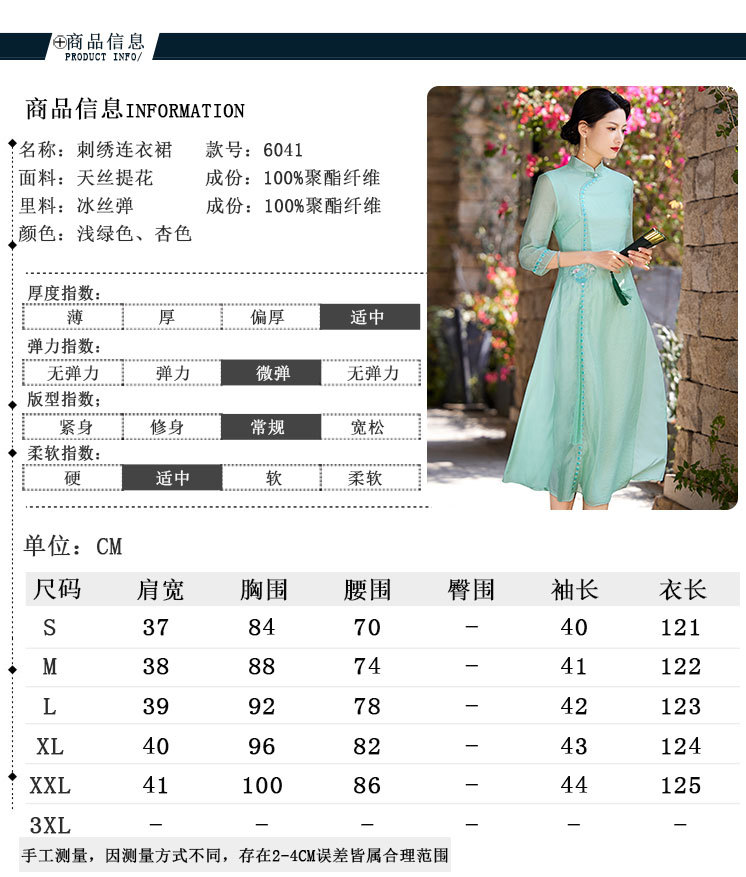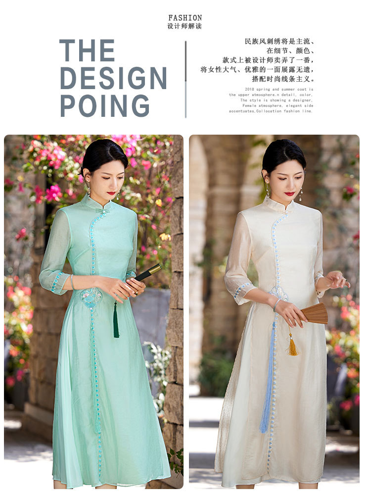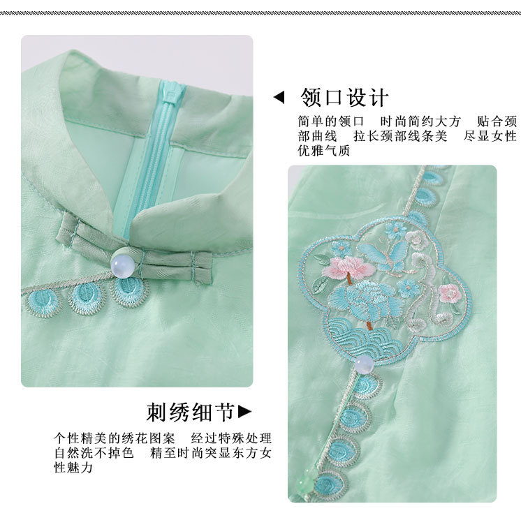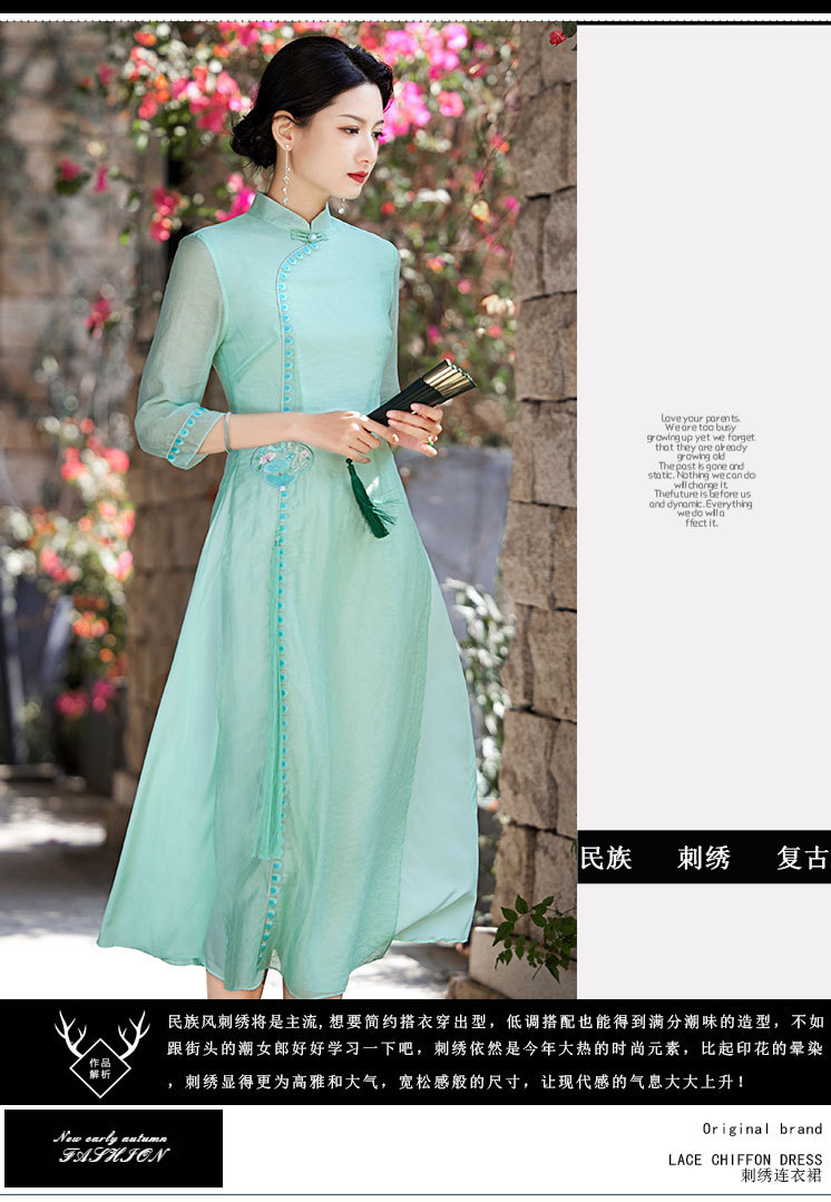 复古民族风,新中式改良旗袍修身假两件奥黛立领国潮刺绣连衣裙OG-6041