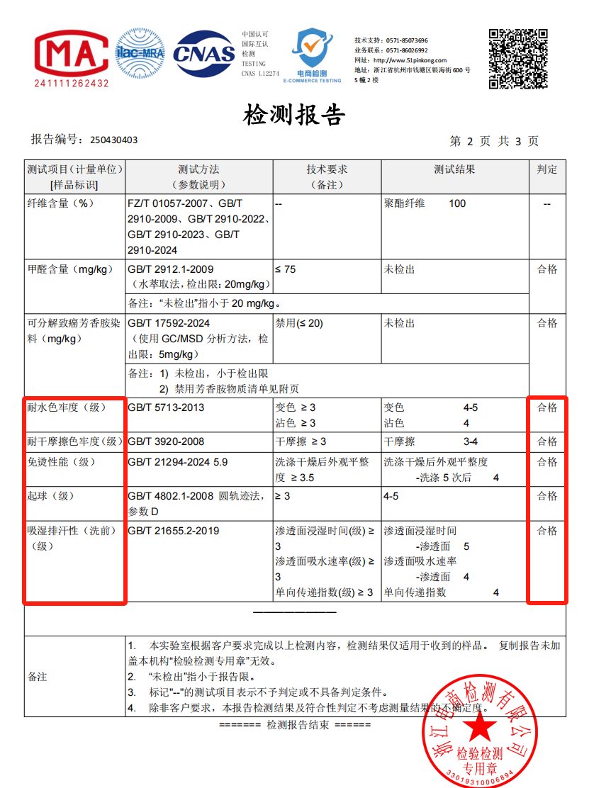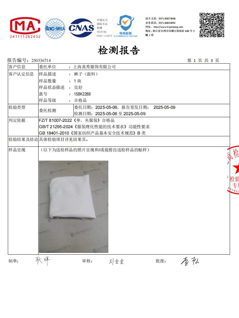 两色的夏裤是功能性面料,免烫不易皱,有弹力,耐摩擦,不易起球,不褪色,附上我们的机构检测报告