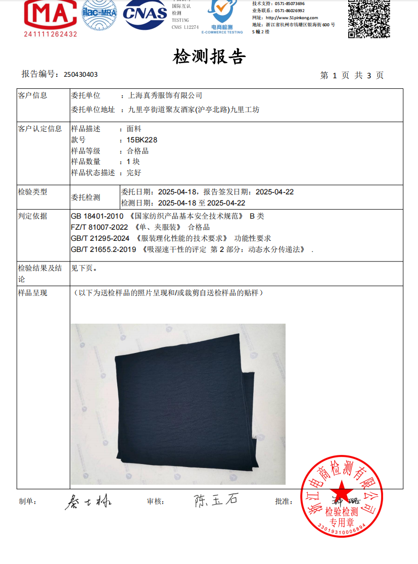 裤子藏蓝色的这款也是不易褪色的,选这个面料也有找面料专业检测机构去做检测,结果在这边~