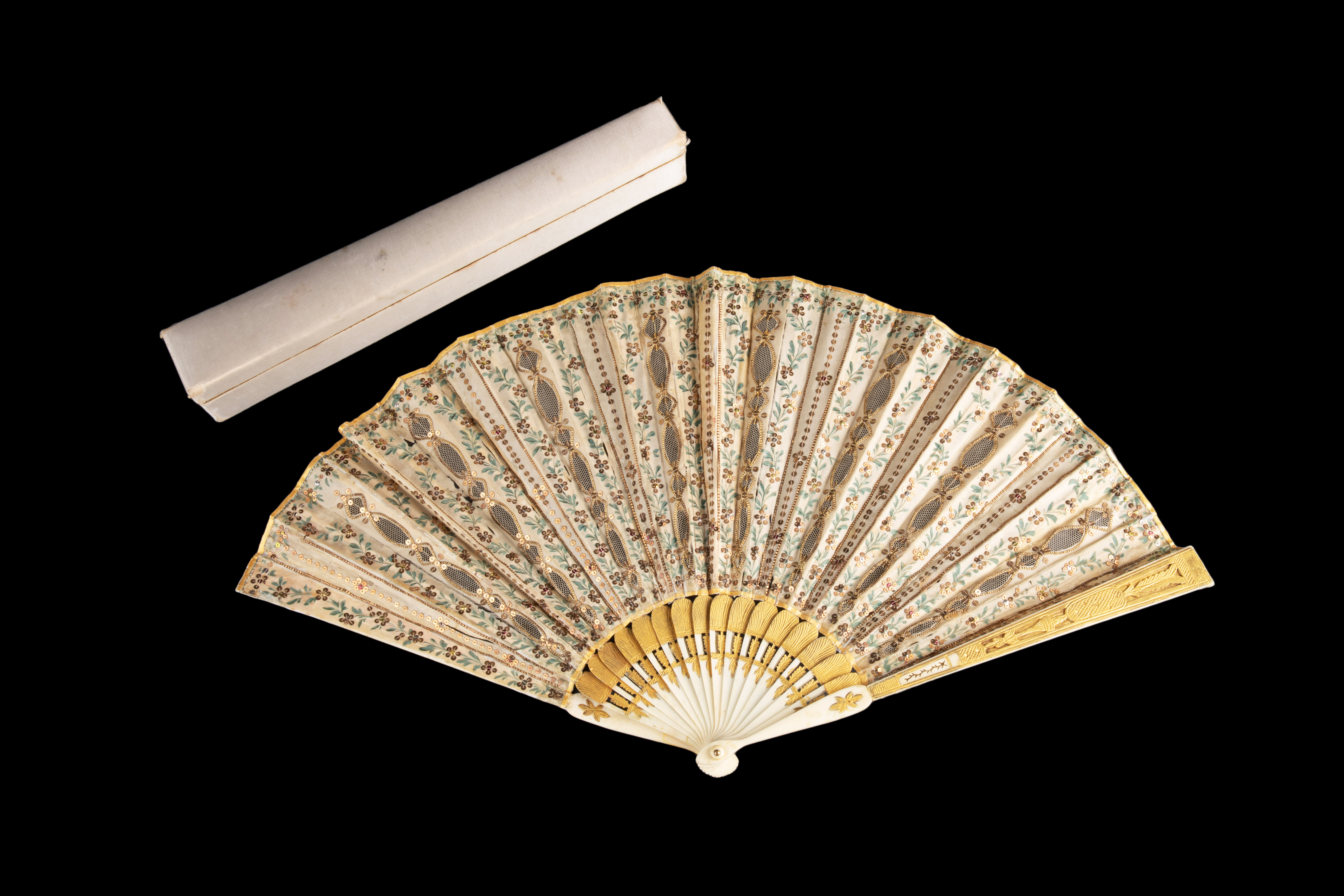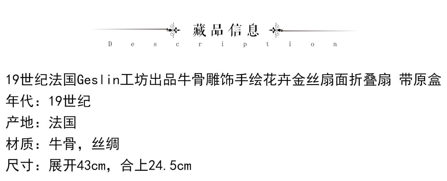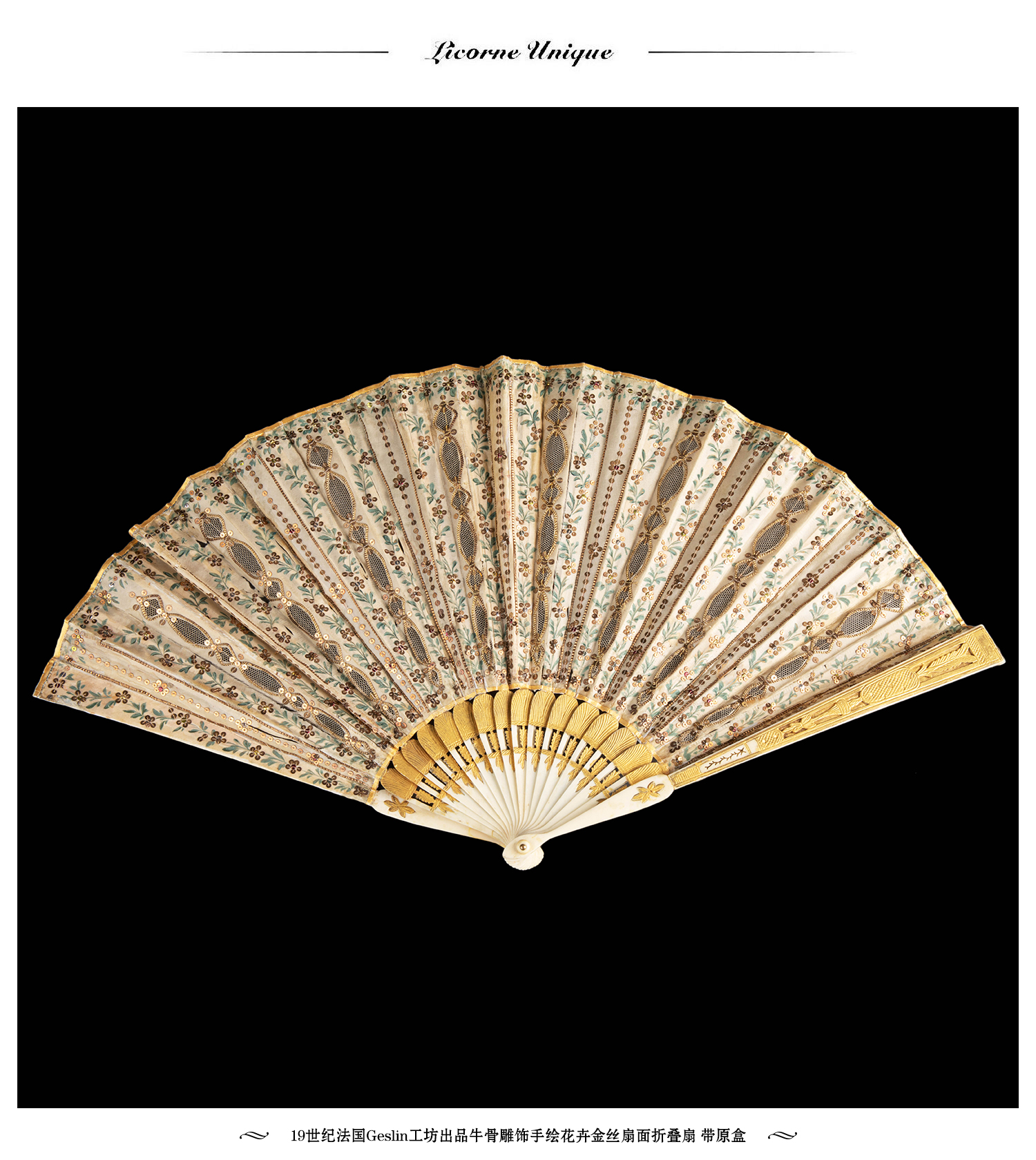 独角鹿西洋古董Geslin工坊牛骨雕饰手绘花卉金丝扇面折叠扇带原盒