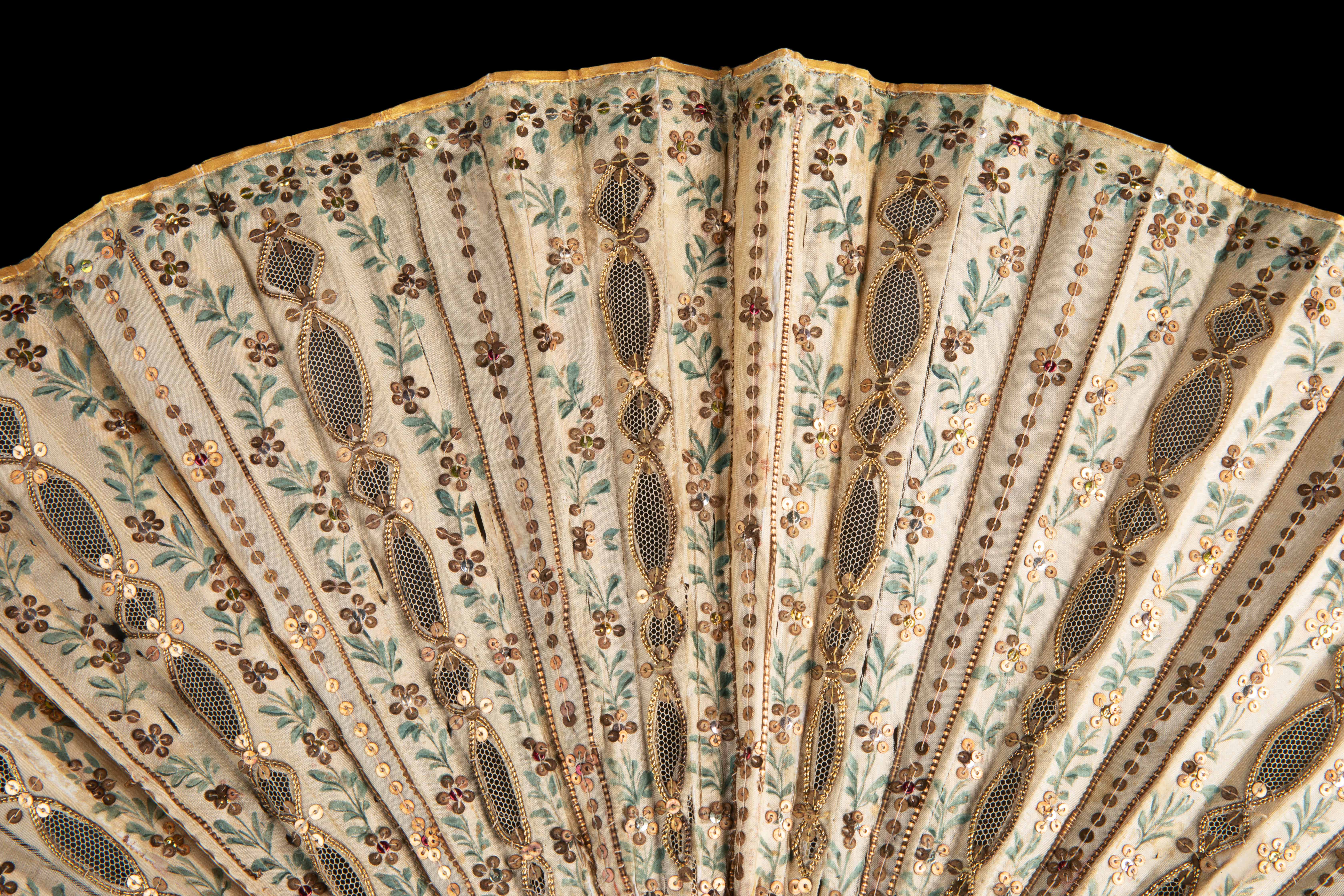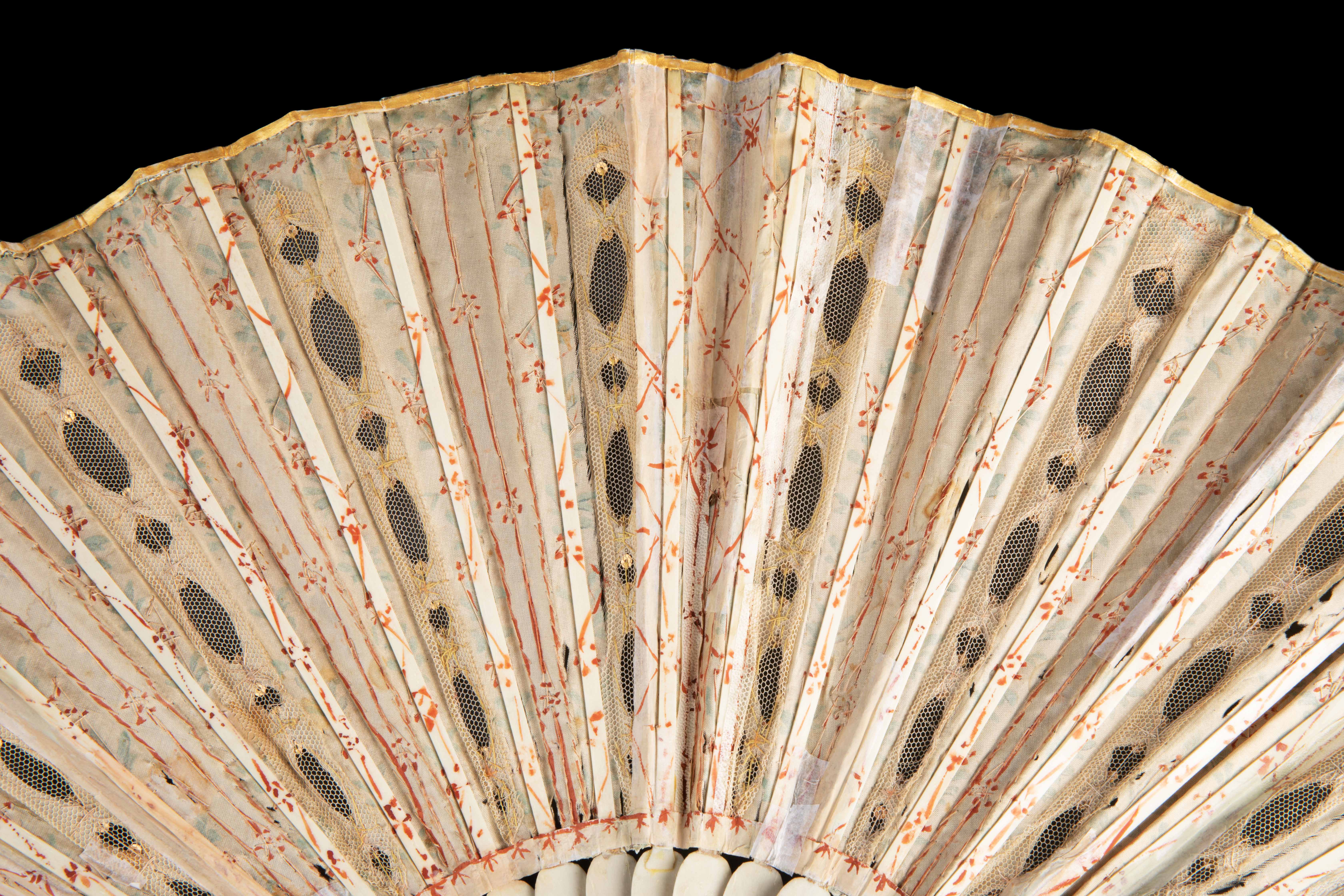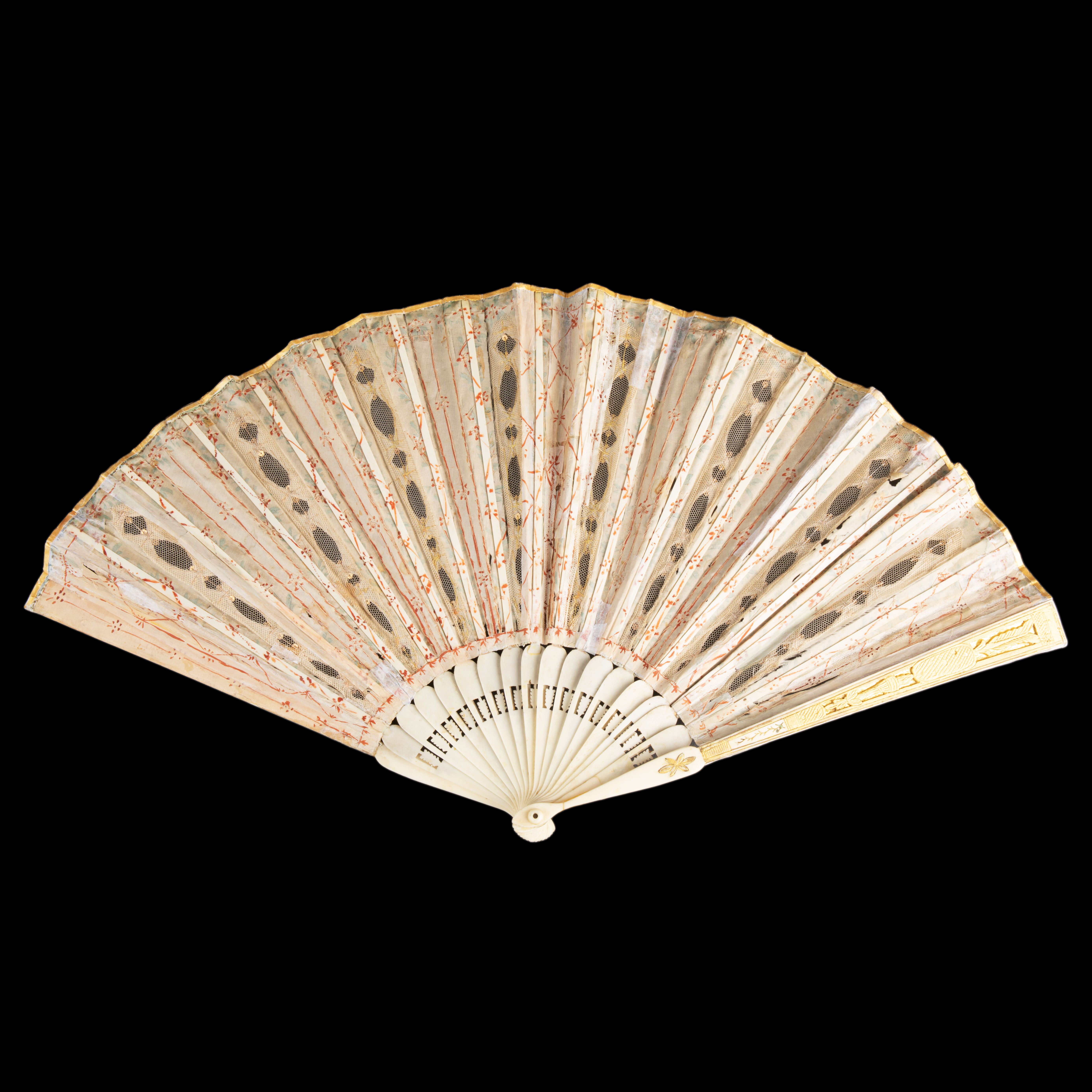 独角鹿西洋古董Geslin工坊牛骨雕饰手绘花卉金丝扇面折叠扇带原盒