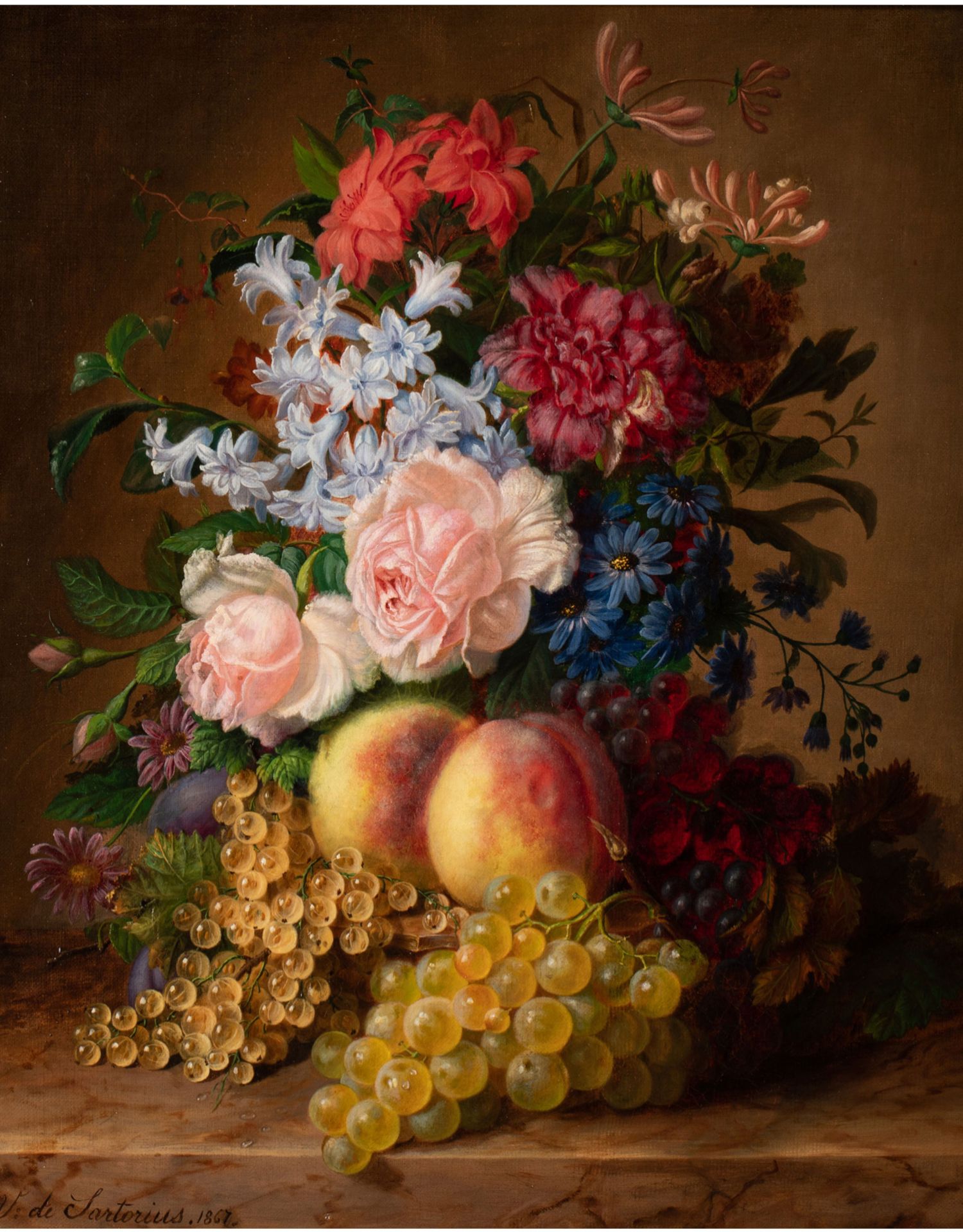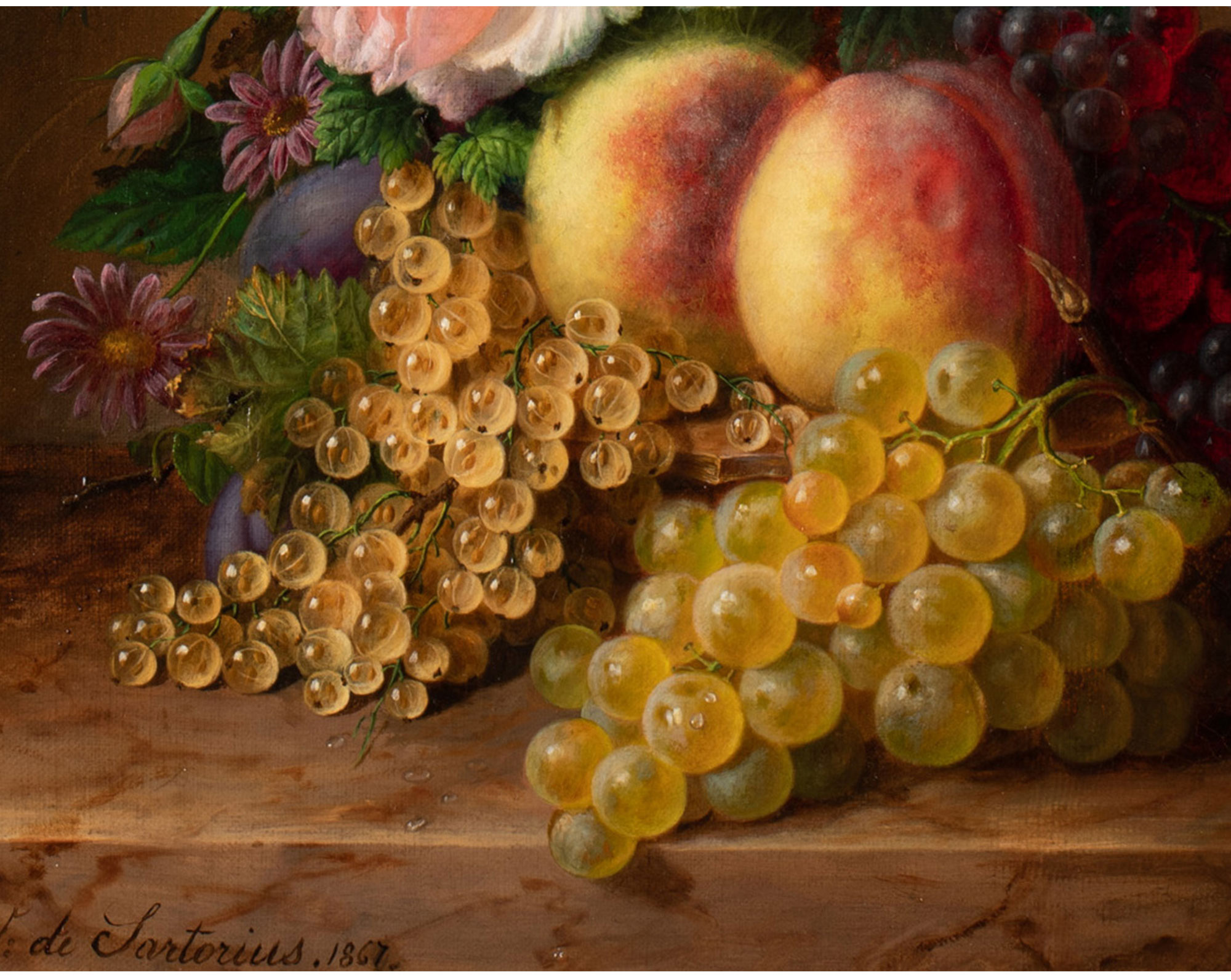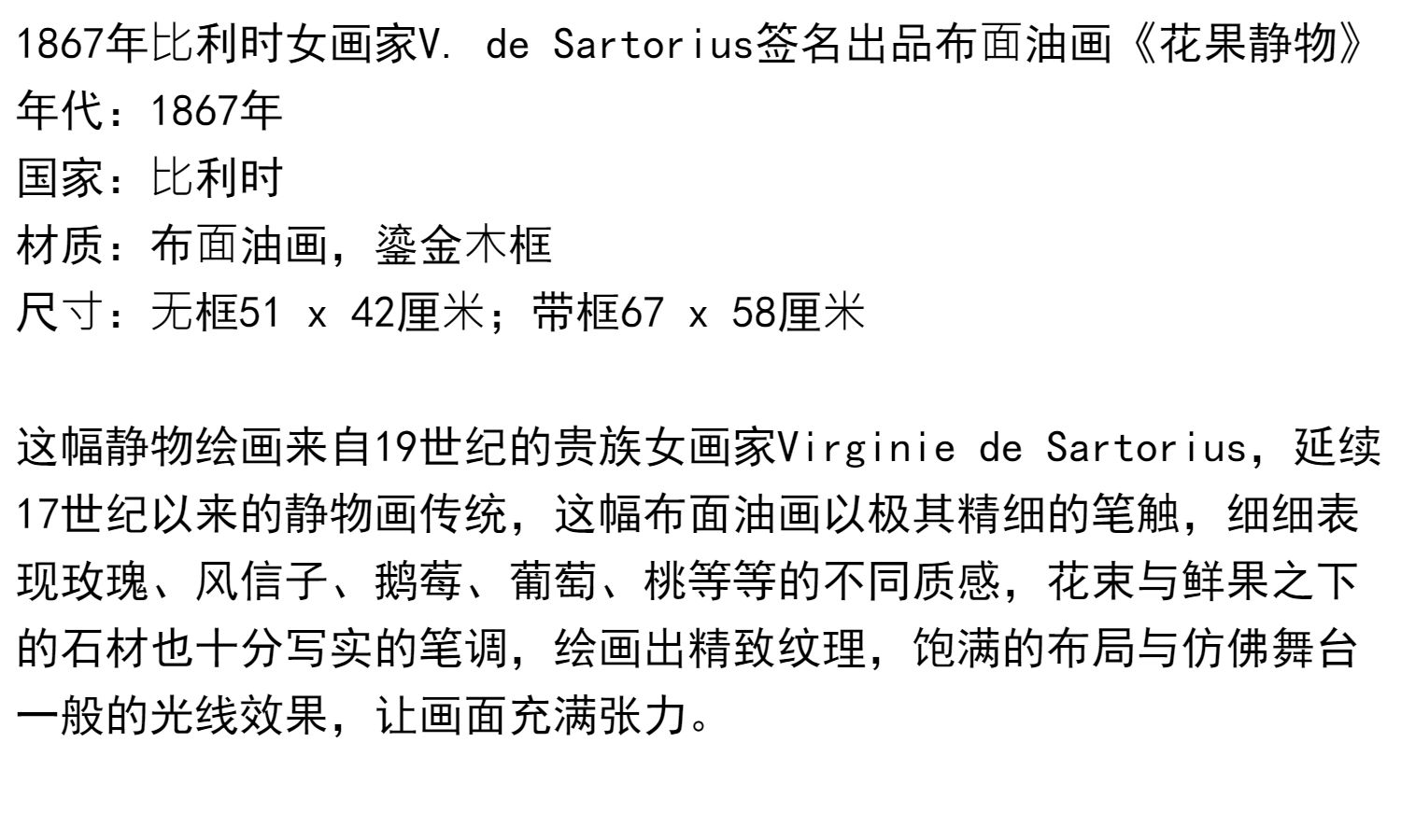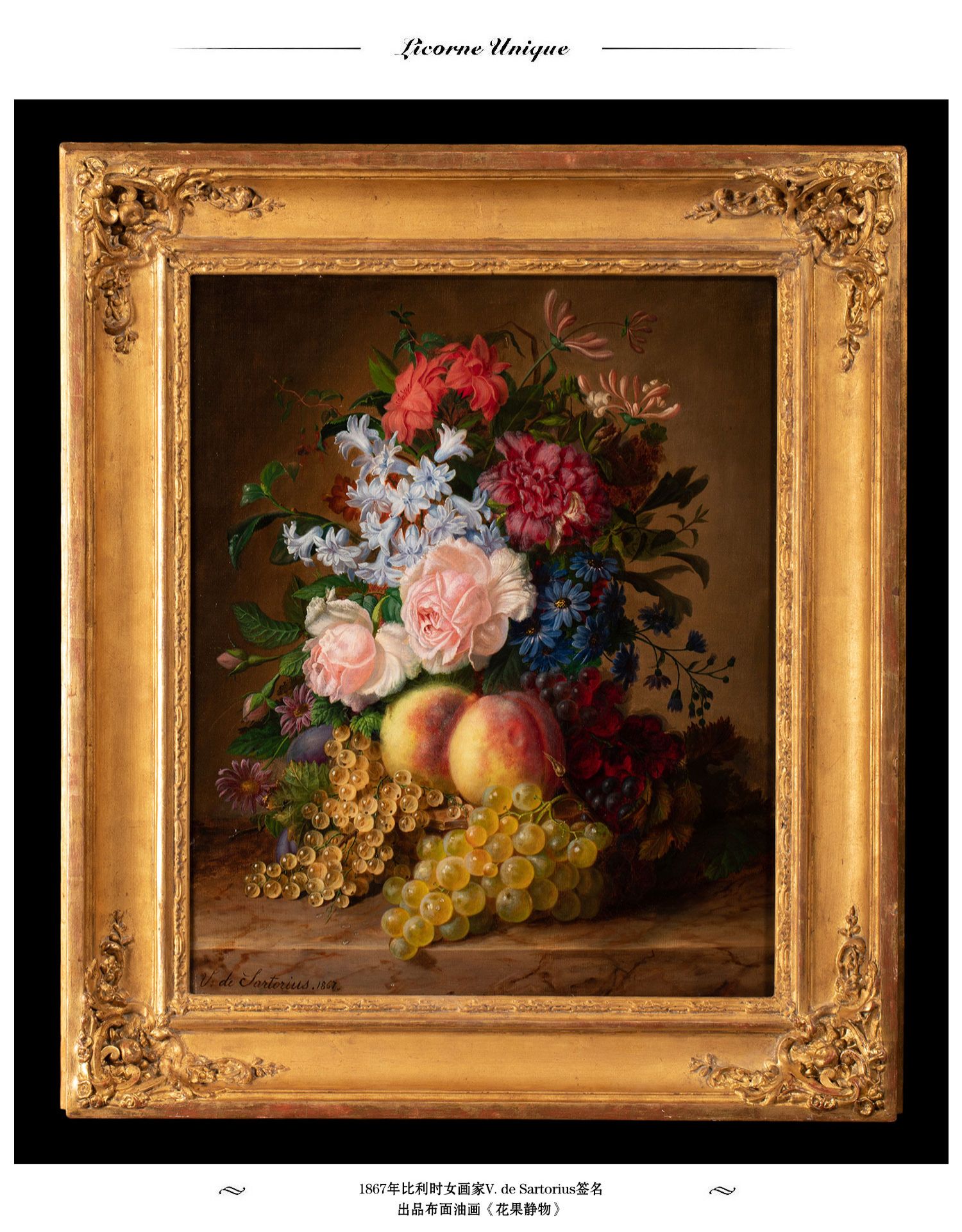 独角鹿西洋古董⽐利时画家V. de Sartorius签名布⾯油画花果静物
