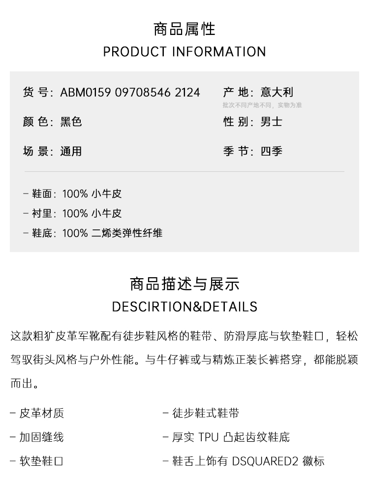 DSQUARED2 男士军用作战短靴 黑色 ABM0159 09708546 2124